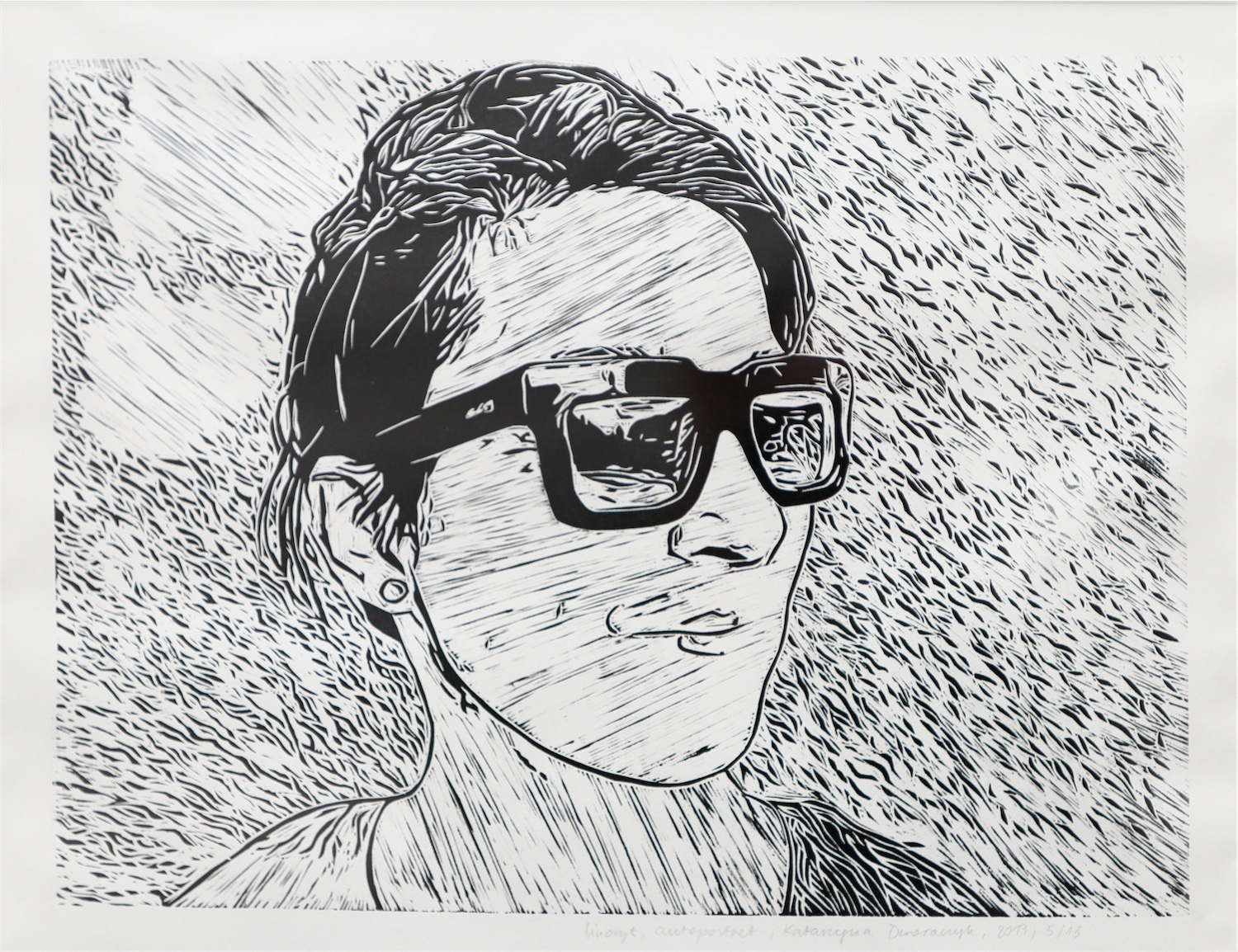 sygn. d.: "linoryt,autoportret, Katarzyna Dworaczyk, 5/13, 2017"