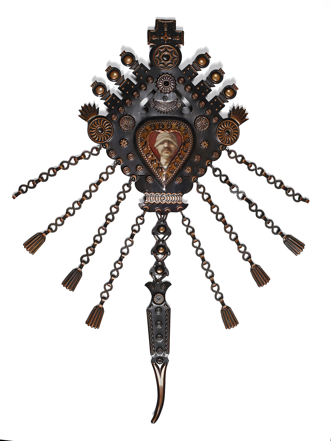 olej, sklejka, miedziana oprawa w formie gólaskiej spinki o kształcie parzenicy;