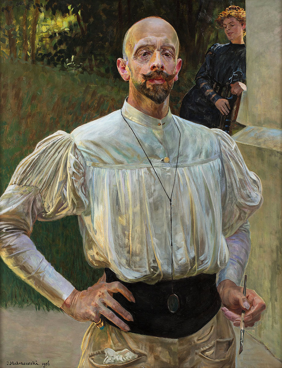W oferowanym „Autoportrecie z pędzlem w dłoni” z 1906 roku Malczewski jawi się nam jako Wielki Artysta, kapłan sztuki. Ujęty w półpostaci, stoi w uroczystej pozie, z dumnie wypiętą piersią. Ubrany jest w swoją ulubioną bufiastą koszulę, szeroki czarny pas i beżowy dół z obfitymi kieszeniami. Strój uzupełniają zawieszony na szyi monokl, złoty sygnet z turkusem oraz dzierżone w dłoni malarskie berło – pędzel. Co ciekawe, charakterystyczna biała bluzka, w której tak często się przedstawiał, stanowiła w istocie typowy element ówczesnej mody damskiej. Trzeba jednak pamiętać, że Malczewski był mocno ekscentryczny, zarówno w zachowaniu, jak i noszeniu się, czego świadectwem pozostają jego autoportrety, a także wspomnienia bliskich: „Ubrany był zawsze oryginalnie w jakieś bluzki aksamitne a la Rembrandt. Lubował się w kamizelkach kolorowych, których miał kilka. Na nogach nosił owijacze. Pamiętam pana Jacka w serdaku granatowym pani Gralewskiej, bardzo obszernym, wciętym; pamiętam go w czepeczkach najrozmaitszych, hełmach, furażerkach, beretach; w końcu nosił szyte przez swoją starsza siostrę jakby renesansowe okrycie głowy, zakrywające uszy. »Widzisz duszo – mówił – Wyglądam jak hrabia.« (…) Jednego razu tak zachwycił się fasonem rękawów mojej bluzki, że uparł się ją włożyć. Tłumaczyliśmy, że będzie za ciasna, że nie da się przymierzyć. Lecz koniecznie chciał i tak mnie prosił, że ubrałam się w suknię pani Malczewskiej, a pan Jacek paradował w mojej bluzce aksamitnej, chociaż uwięzła mu na plecach” – pisała Michalina Janoszanka (Janoszanka M., Wielki tercjarz. Moje wspomnienia o Jacku Malczewskim, Poznań [ok. 1931], s. 26).