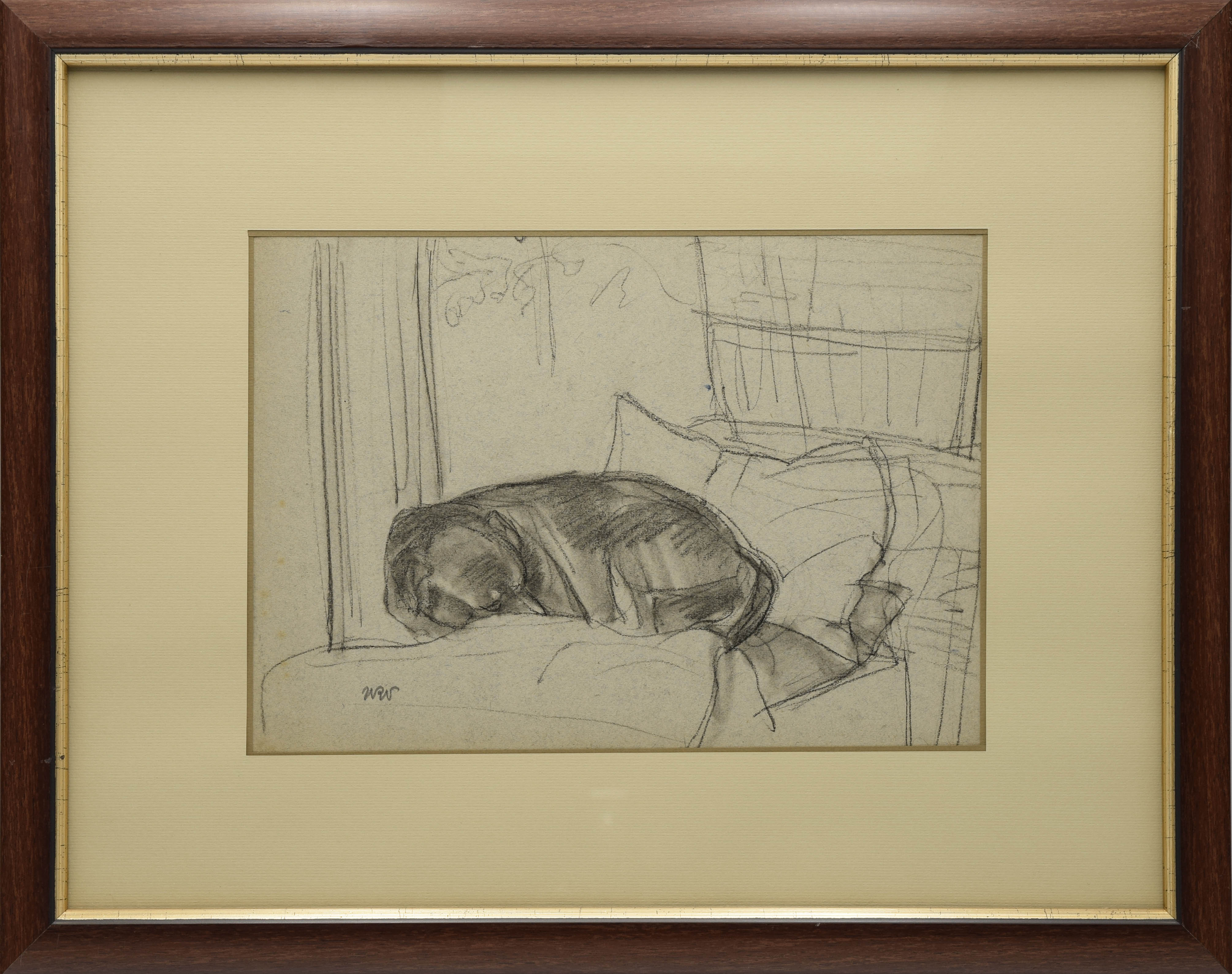 węgiel, papier jasnoszary; 21 x 29,5 cm (w świetle oprawy); sygn. l. d.: WW (ołówkiem); na odwrocie dwa studia głowy psa rysowane węglem; w lewym górnym rogu przy krawędzi nr 001443 i stempel z faksymile artysty WWeiss.