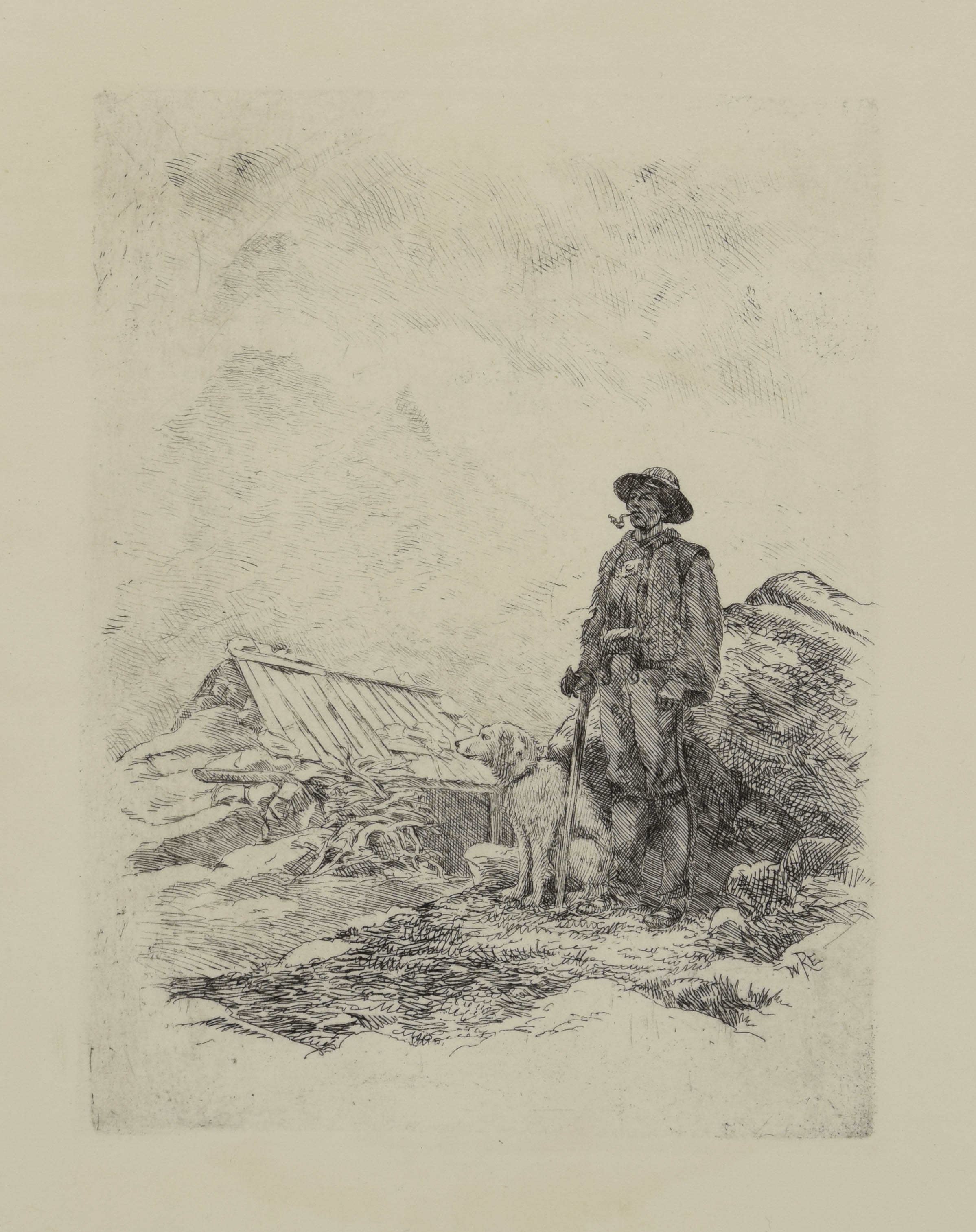 akwaforta, papier; 21 x 15,5 cm (odcisk płyty), 30 x 23,5 cm (wymiar arkusza w świetle oprawy); na odwrocie nalepka z Salonu Dzieł Sztuki Kazimierza Wojciechowskiego z datą przyjęcia 1942, z tytułem: Baca pod szałasem z psem i nr 13359.