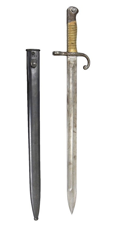 Rękojeść stalowa z okładzinami mosiężnymi, poprzecznie karbowanymi. Jelec z pierścieniem w części grzbietowej i przednim ramieniem wygiętym ku głowni, zakończonym gałką. Głowica z prowadnicą w części grzbietowej i okrągłą gałką przycisku zatrzasku blokującego, po stronie wewnętrznej. Na głowicy punca - litery RA w owalu - Republika Argentyna, przy jelcu po obu stronach litera M w okręgu. Na grzbiecie numer 731. Na jelcu stempel - litera P i krzyżyk. G ł o w n i a stalowa, prosta, obustronnie szlifowana w jedną bruzdę. Pióro obosieczne z ością, sztych symetryczny. Na zewnętrznym progu zatarta sygnatura Modelo Argentina 1891 oraz seria i numer C4517. Na wewnętrznym progu WEYERSBERG/KIRCHBAUM & Co/SOLINGEN. Na grzbiecie litera A zwieńczona krzyżem. Pochwa stalowa, oksydowana z zaczepem do żabki po stronie zewnętrznej. Szyjka mocowana do płaszcza śrubą, pod nią seria i numer C4517. Pochwa zakończona gałką, sygnowaną literami RA w owalu.