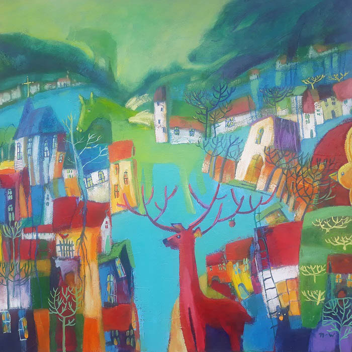 akryl, olej/płótno, 100 x 100 cm,sygnowany monogramem p.d.,sygnowany, datowany i opisany na odwrociu: 'Natalia Nasada-Wojtal ,,Bajka na dobranoc,, 2021'