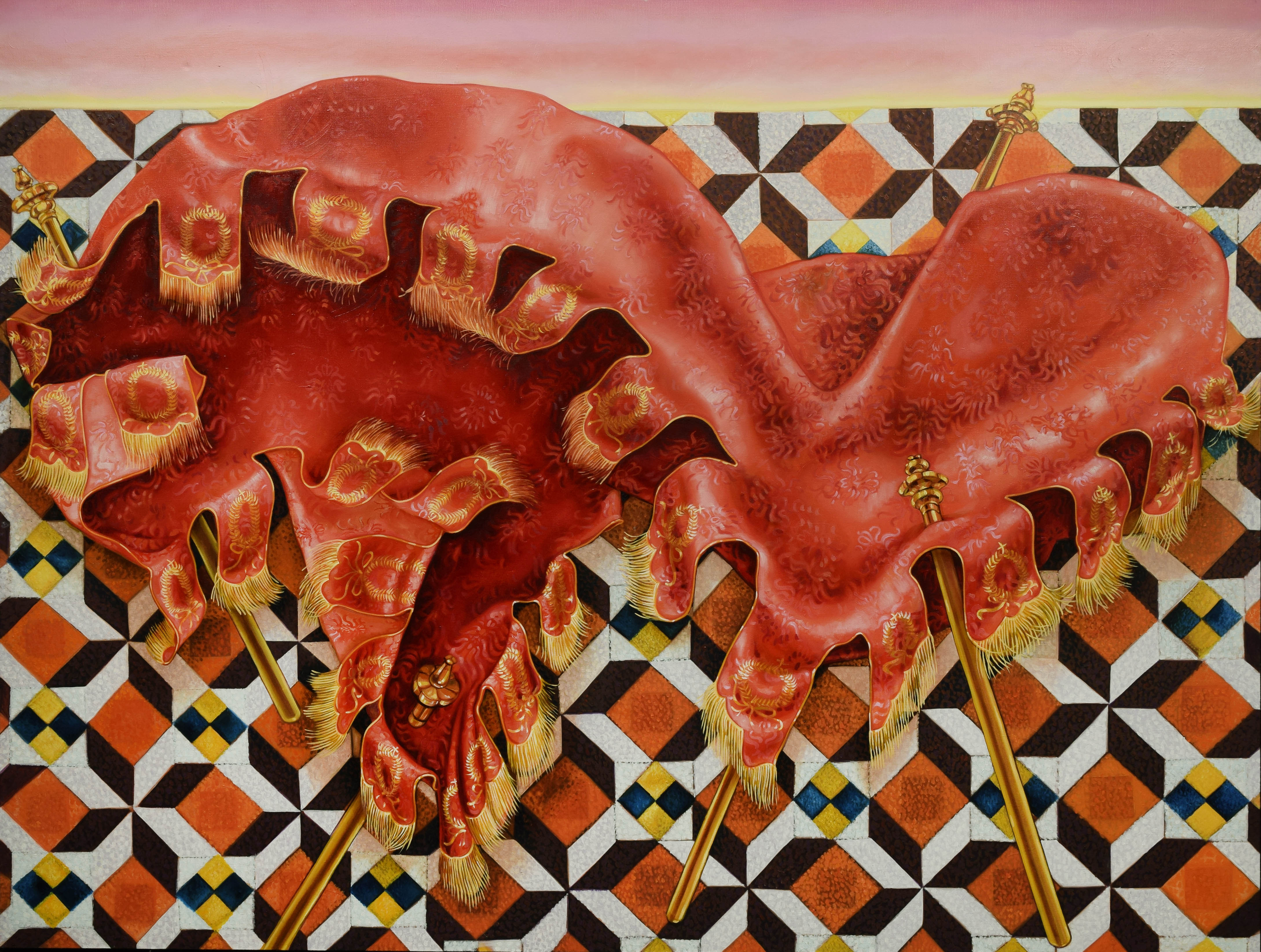 Baldachim zaś to forma, która w europejskiej tradycji chrześcijańskiej była osłoną roztaczaną podczas procesji religijnych nad monstrancją, czy świętymi relikwiami. Podkreślał istnienie strefy sacrum w przestrzeni profanum. Kolor i deseń na obrazie są inspirowane ciężkimi kotarami, które widziałam w pałacach Wenecji. Kształt i forma baldachimu nawiązują do odlanej z brązu konfesji Barberinnich nad grobem św. Piotra w Watykanie, z charakterystycznymi rozwianymi lambrekinami.
