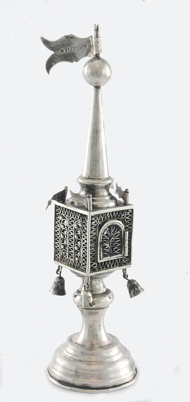Balsaminka wsparta na kolistej, kopulastej, profilowanej stopie z tralkowym trzonem, z pojemnik na wonności w formie sześciennej, ażurowej, pseudofiligranowej puszki z drzwiczkami, z podwieszonymi czterema dzwoneczkami, z chorągiewkami w górnych narożach, nakrytej stożkowym daszkiem i zwieńczonej kulką z chorągiewką.