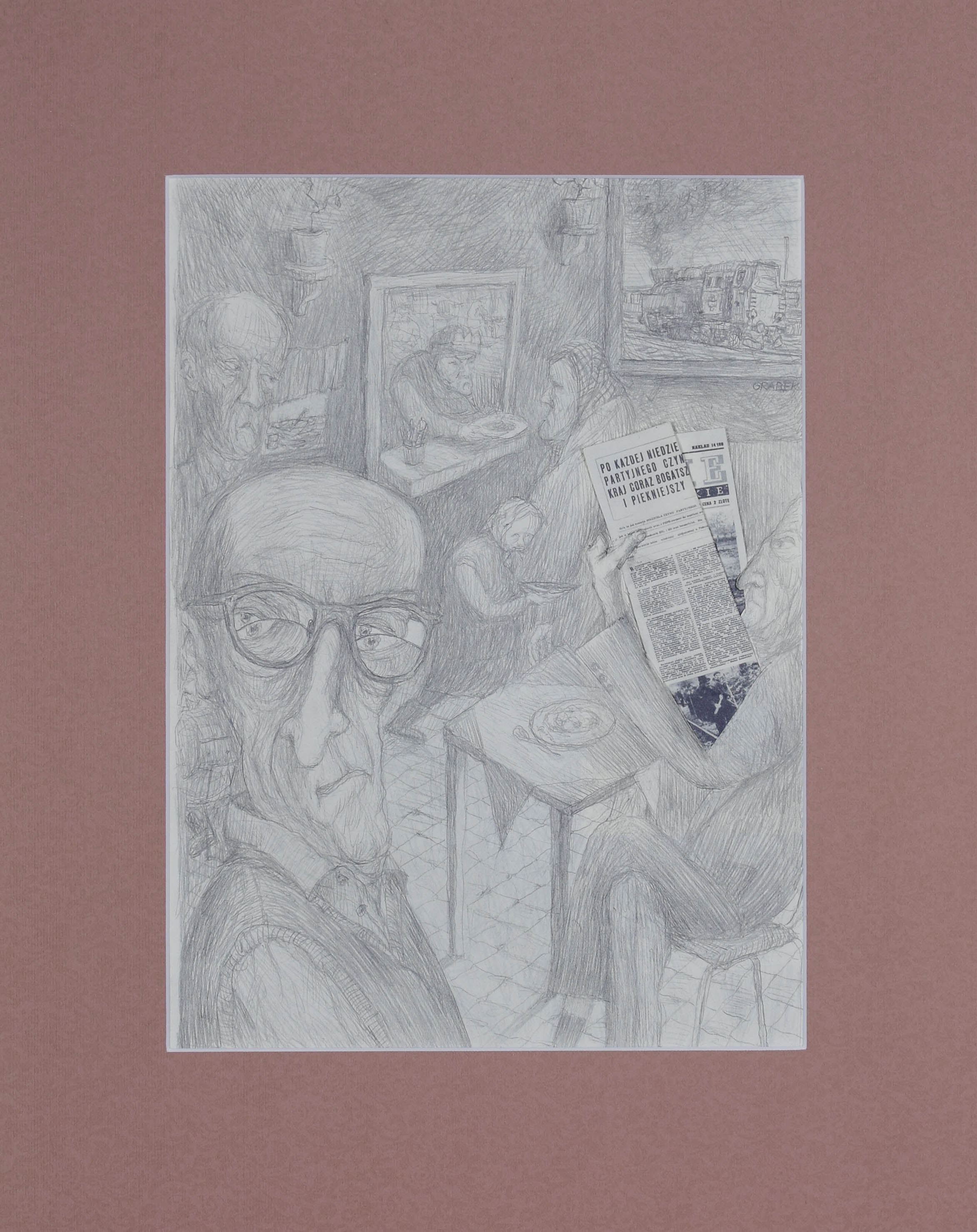 rysunek, collage, ołówek; 29 x 21 cm (w świetle passe-partout);