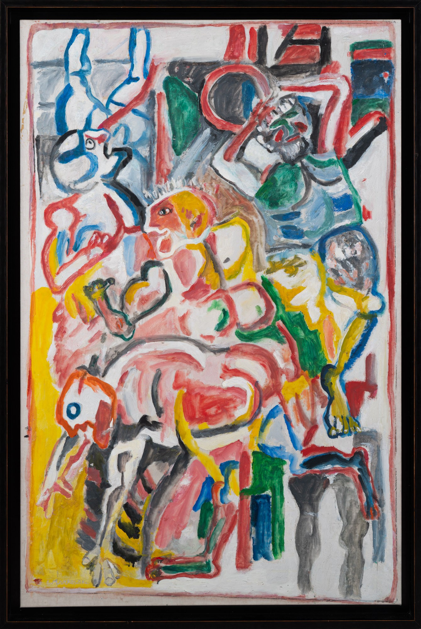 Obrazy Eugeniusza Markowskiego wykorzystujące elementy kolażowe są rzadziej spotykane na rynku aukcyjnym niż klasyczne płótna, co czyni oferowany obraz szczególnie interesującym z perspektywy kolekcjonerskiej. Duży format podkreśla jego walory ekspozycyjne. Kompozycja „Bez tytułu” utrzymana w charakterystycznym dla artysty ekspresyjnym rytmie, może być odczytywana jako scena figuralna na granicy abstrakcji. Warto zwrócić uwagę na silne akcenty kolorystyczne i deformacje w przedstawieniu postaci. Człowiek i jego emocje w zmieniającym się świecie, pozostawały głównymi tematami jego malarskich dociekań. Artyście w tym procesie często towarzyszyły ironia czy groteska, nadając dziełom wyrazisty, mocny ton.