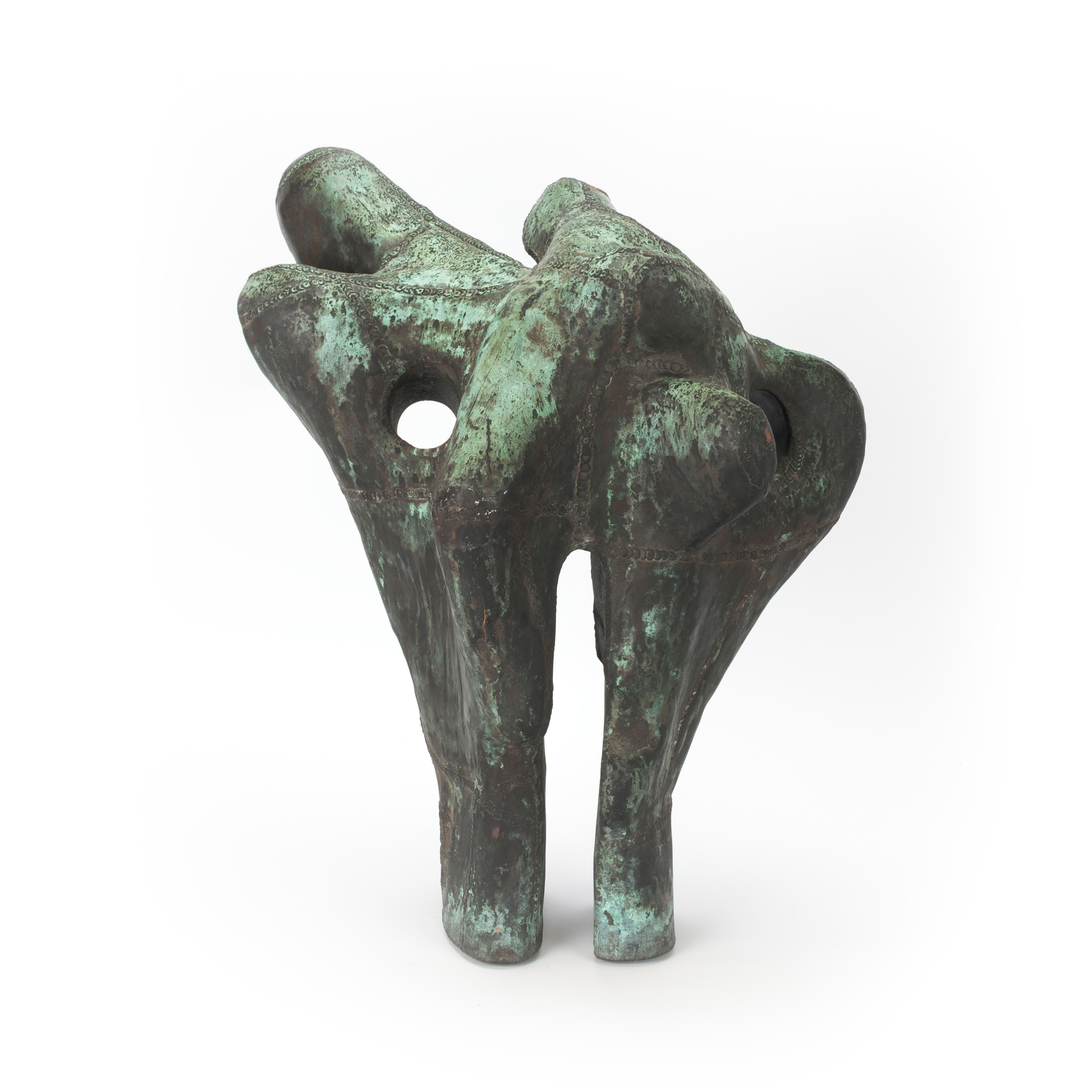 drewno i miedź, patynowana na czarno i częściowo zielono,ok. 50 × 50 × 37 cm; sygn., dat. 70’