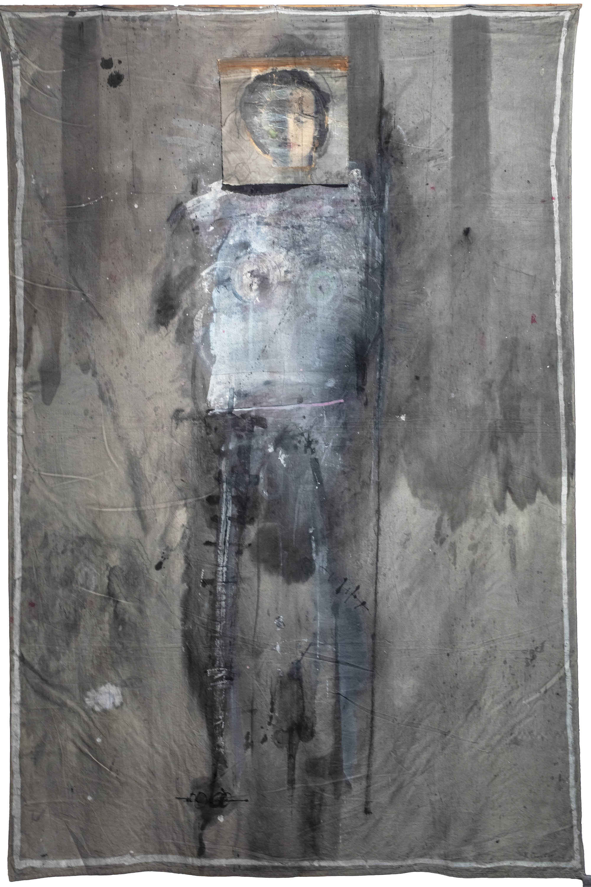 olej, kolaż, płótno (prześcieradło), 200 x 132 cm,