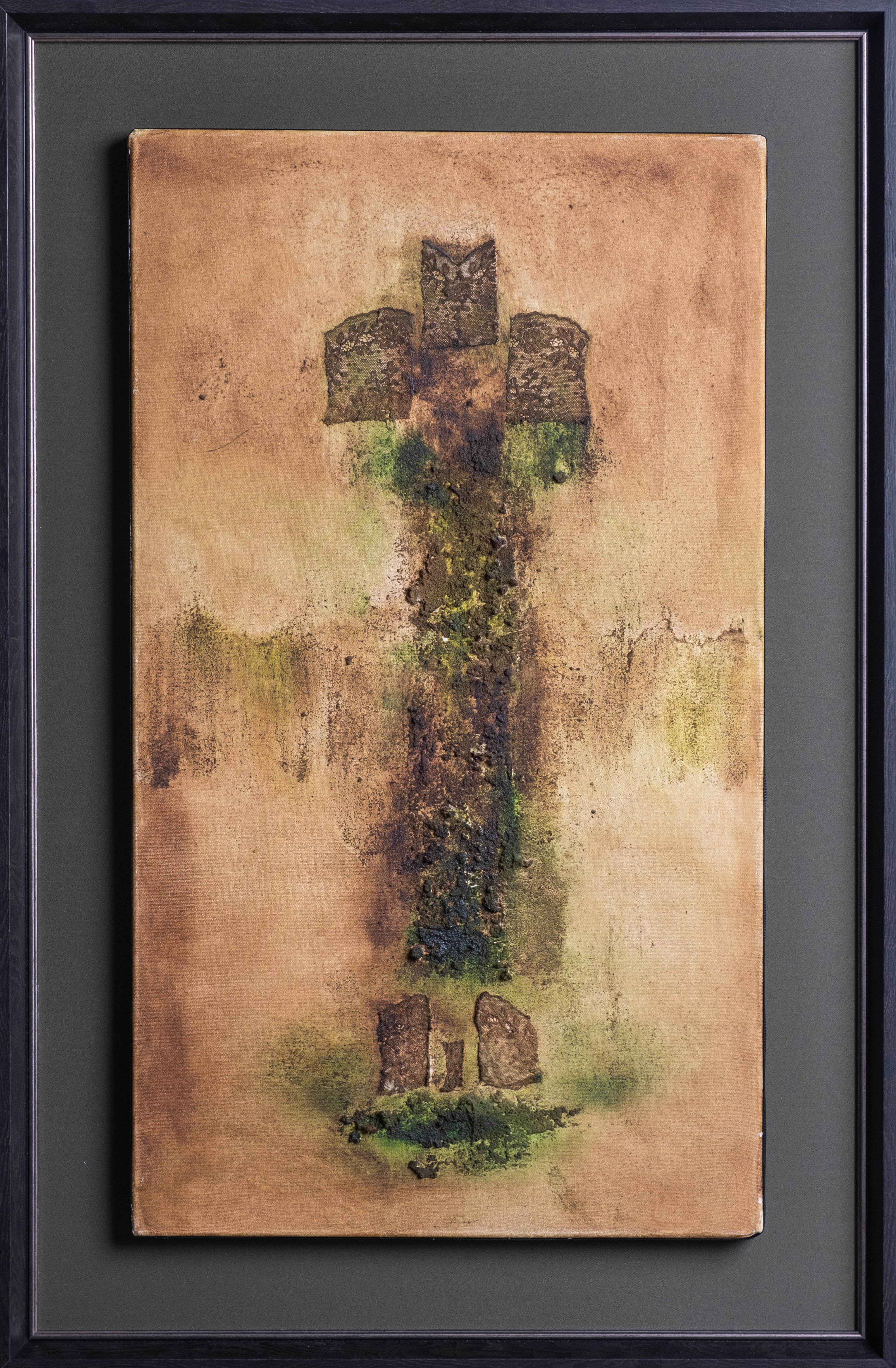technika mieszana - farby olejne na płótnie z wykorzystaniem nakładek z tkanin, sygnowane na odwrocie ramy