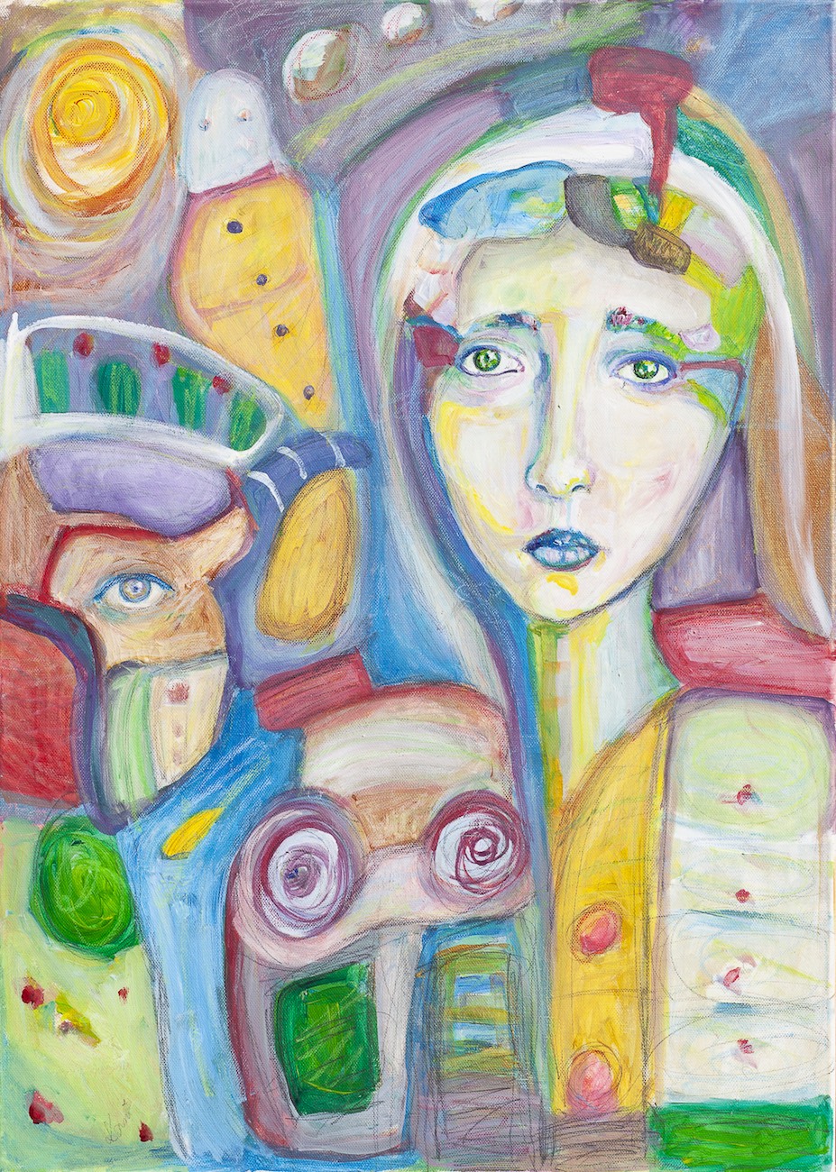 ołówek, akryl, pastele olejne, płótno, 70 x 50 cm