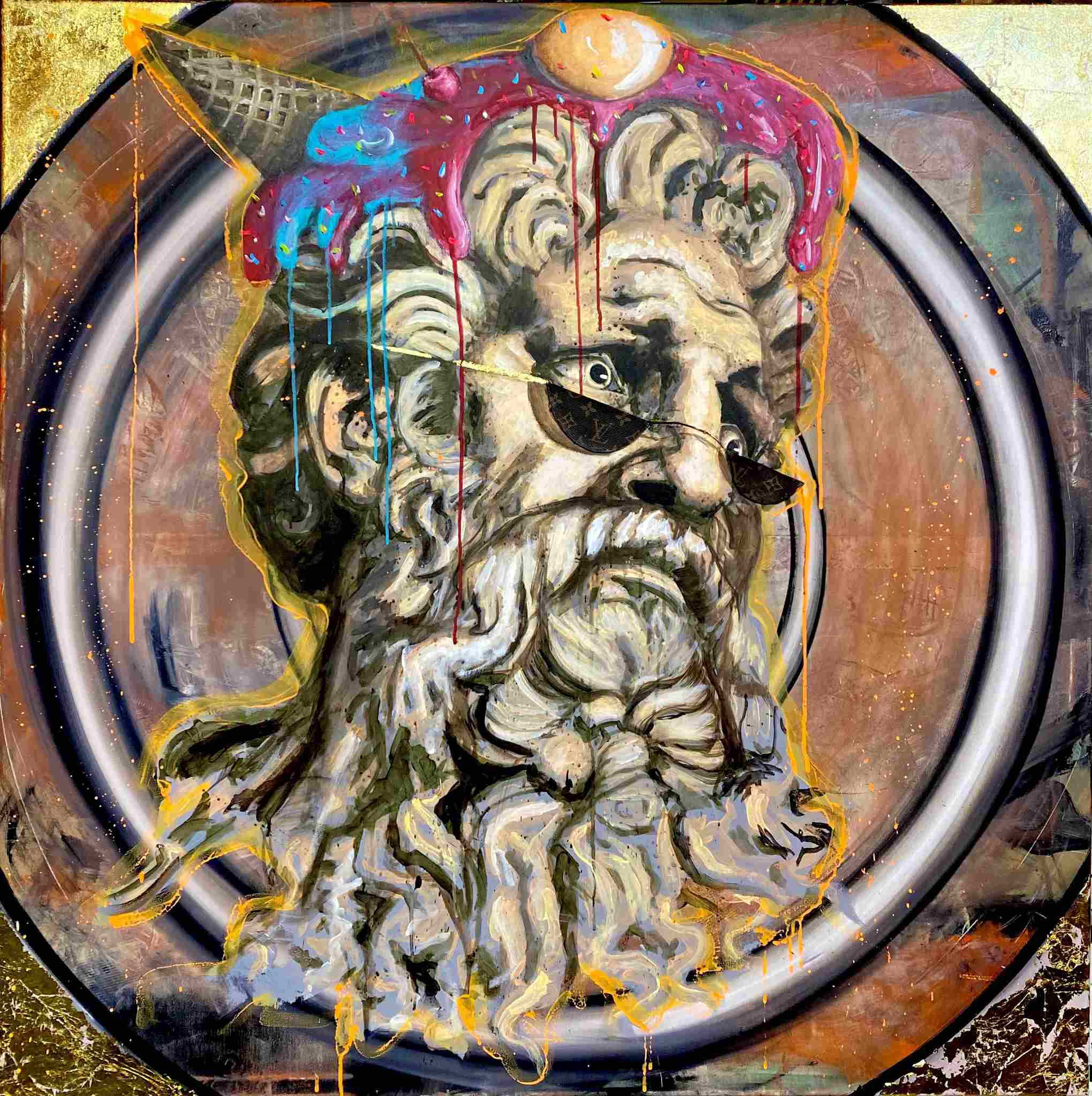 olej, szlagmetal, kolaż, płótno, 120 x 120 cm
