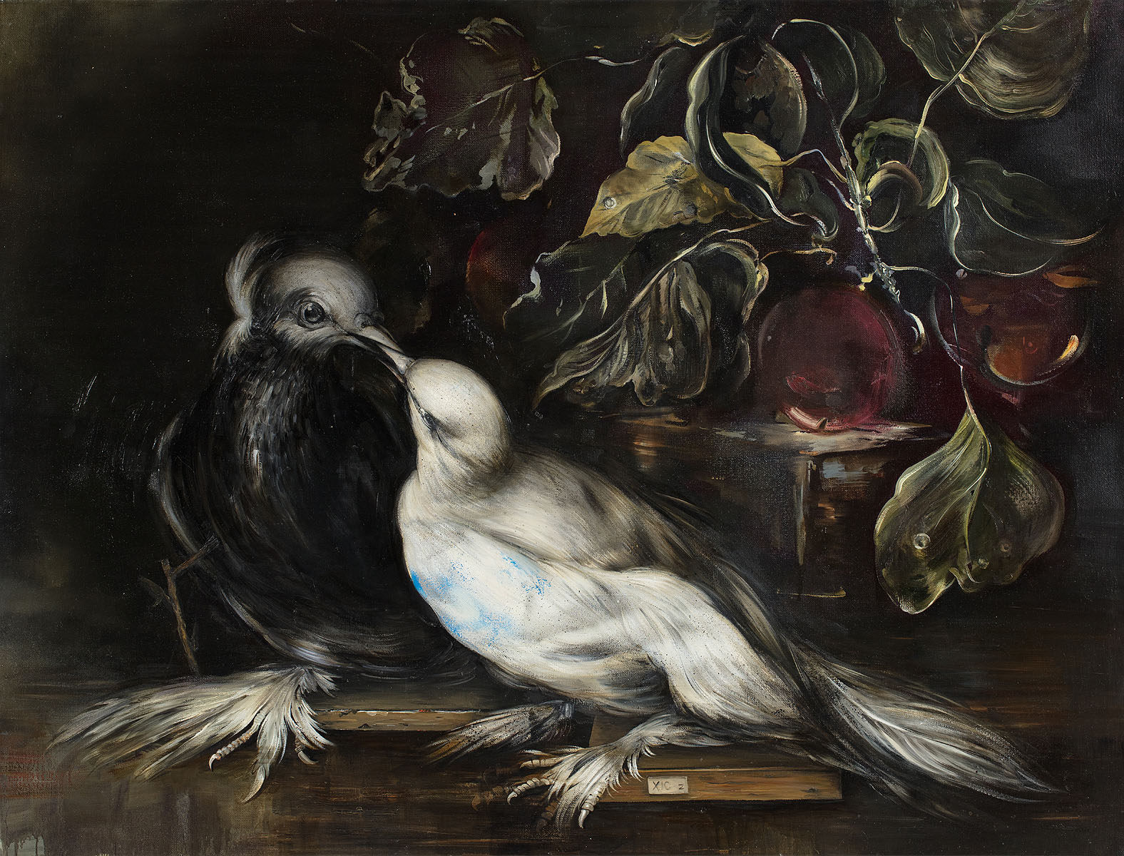 Obraz „Bez tytułu (według Franza Wernera Tamma)” należy do cyklu, w którym Ewa Juszkiewicz podejmuje temat dzieł utraconych – zaginionych w wyniku wojny, pożarów czy grabieży. W swej pracy tej artystka odwołuje się do kompozycji niemieckiego malarza barokowego Franza Wernera Tamma (1658–1724), nadwornego artysty cesarza Leopolda I, autora licznych scen ze zwierzętami i martwych natur. Punktem wyjścia stał się obraz „Para gołębi” z ok. 1700 roku, niegdyś znajdujący się w polskich zbiorach, dziś uznawany za zaginiony.