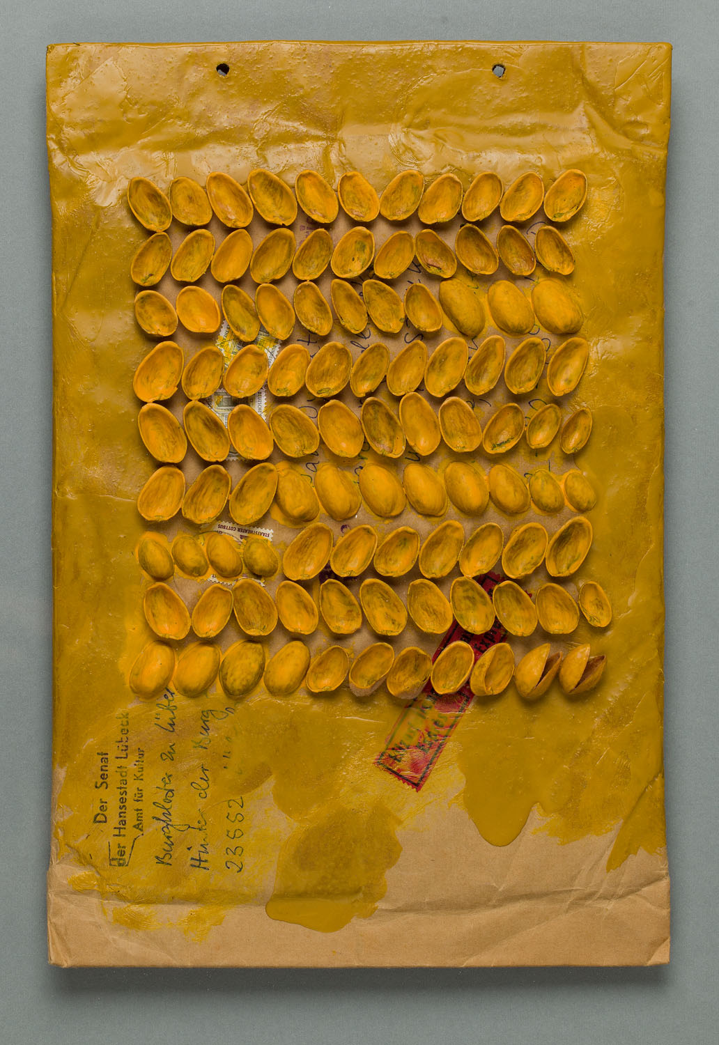 asamblaż, łupiny pistacji, enkaustyka, koperta, olej, 42,5 x 50 cmużyta koperta zaadresowana do dyrektora Muzeum Sztuki w Łodzi