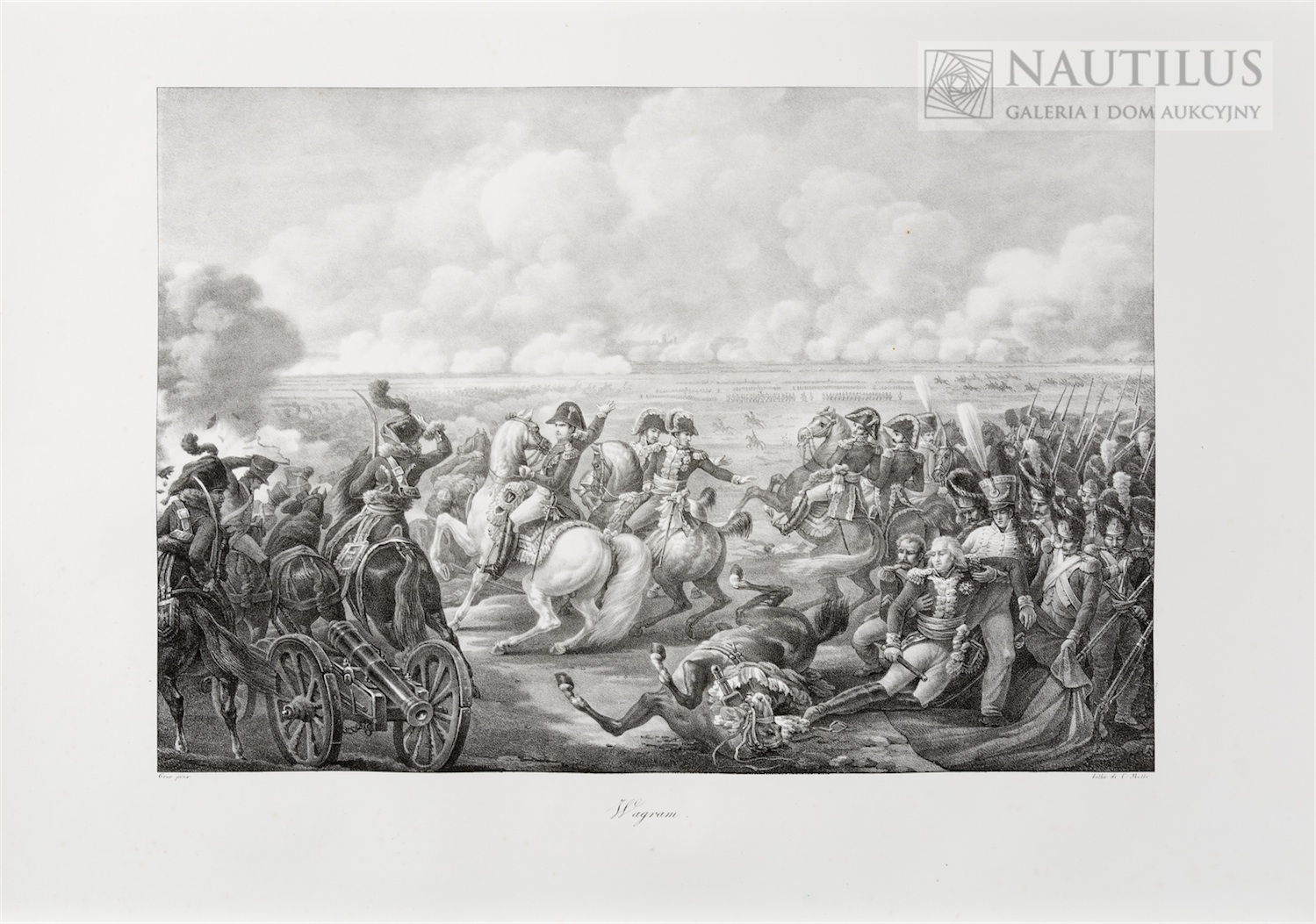 Litografia; wym. komp.: 300 x 435 mm, plansza: 440 x 595 mm, za- chowane pełne marginesy; sygn. pł. l.d.: Gros pinx, p.d.: Litho. De C. Motte; w środku tytuł: Wagram. Pęknięcia dolnego marginesu bez szkody dla kompozycji. Grafika na podstawie obrazu Grosa namalowanego w 1810. Praca publikowana w A.V. Arnault,‘Vie politique et militaire de Napoléon’, Paris, 1822-1826.