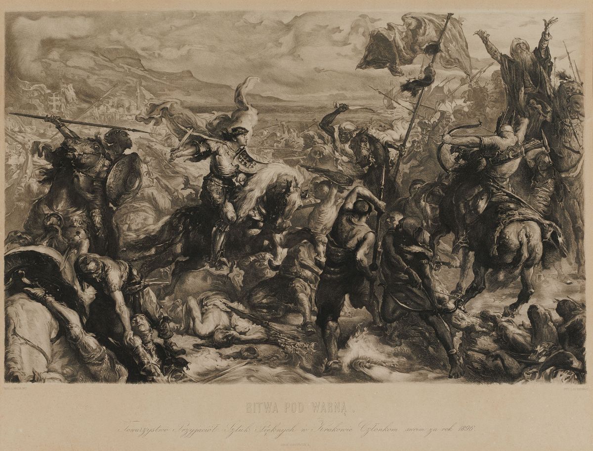 Akwaforta, papier; 40 x 52 cm (w świetle p-p) Napisu: MAL. J. MATEJKO, RYT. I. ŁOPIEŃSKI, BITWA POD WARNĄ | Towarzystwo Przyjaciół Sztuk Pięknych w Krakowie członkom swym za rok: 1896 | DRUK: WETTROTH`A