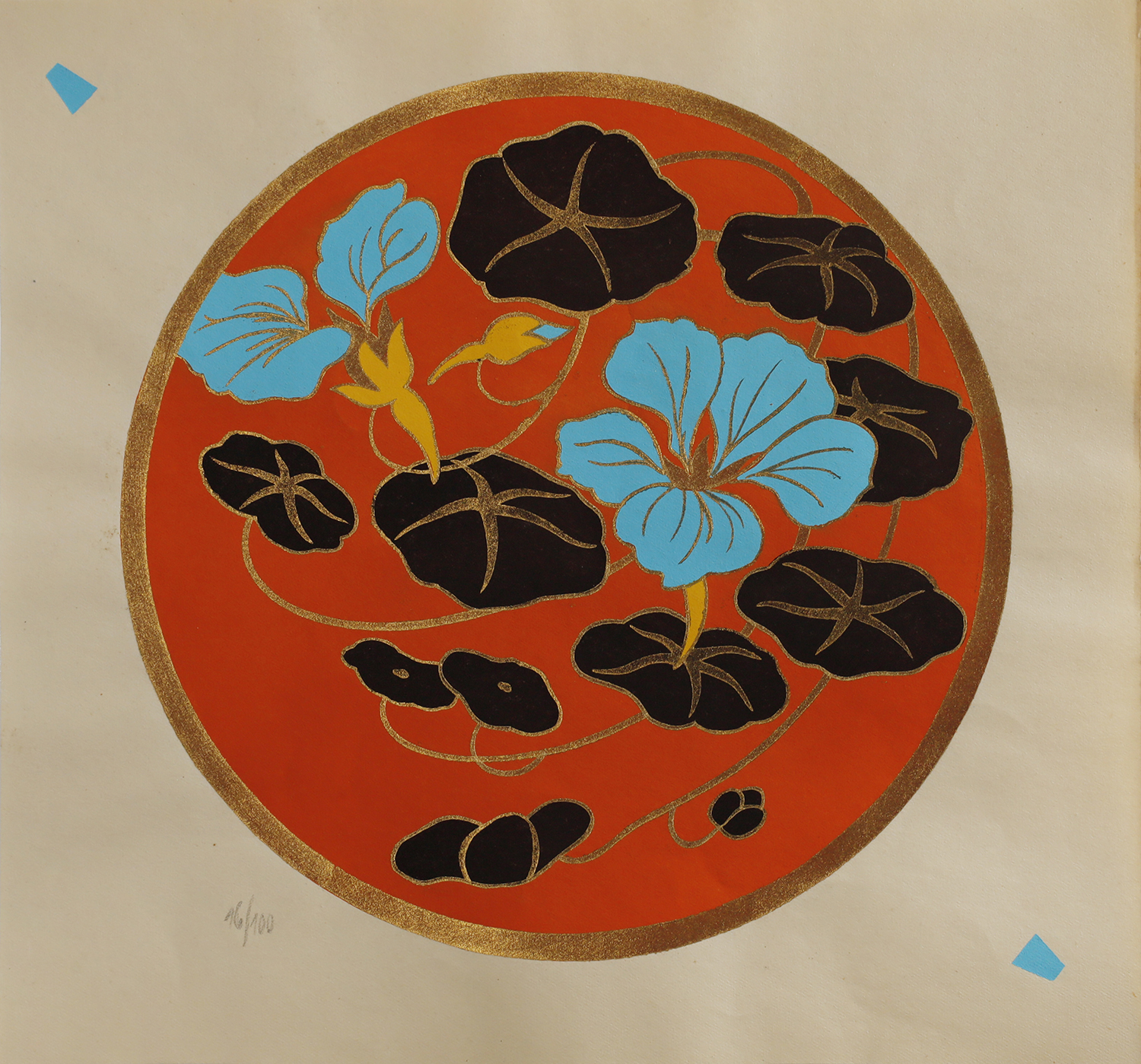 Efektowna grafika w stylu Art-Deco. Obrzeże koła i łodygi oraz cienie na liściach to spatynowana farba złota nie stosowana w poprzednich epokach w grafice.