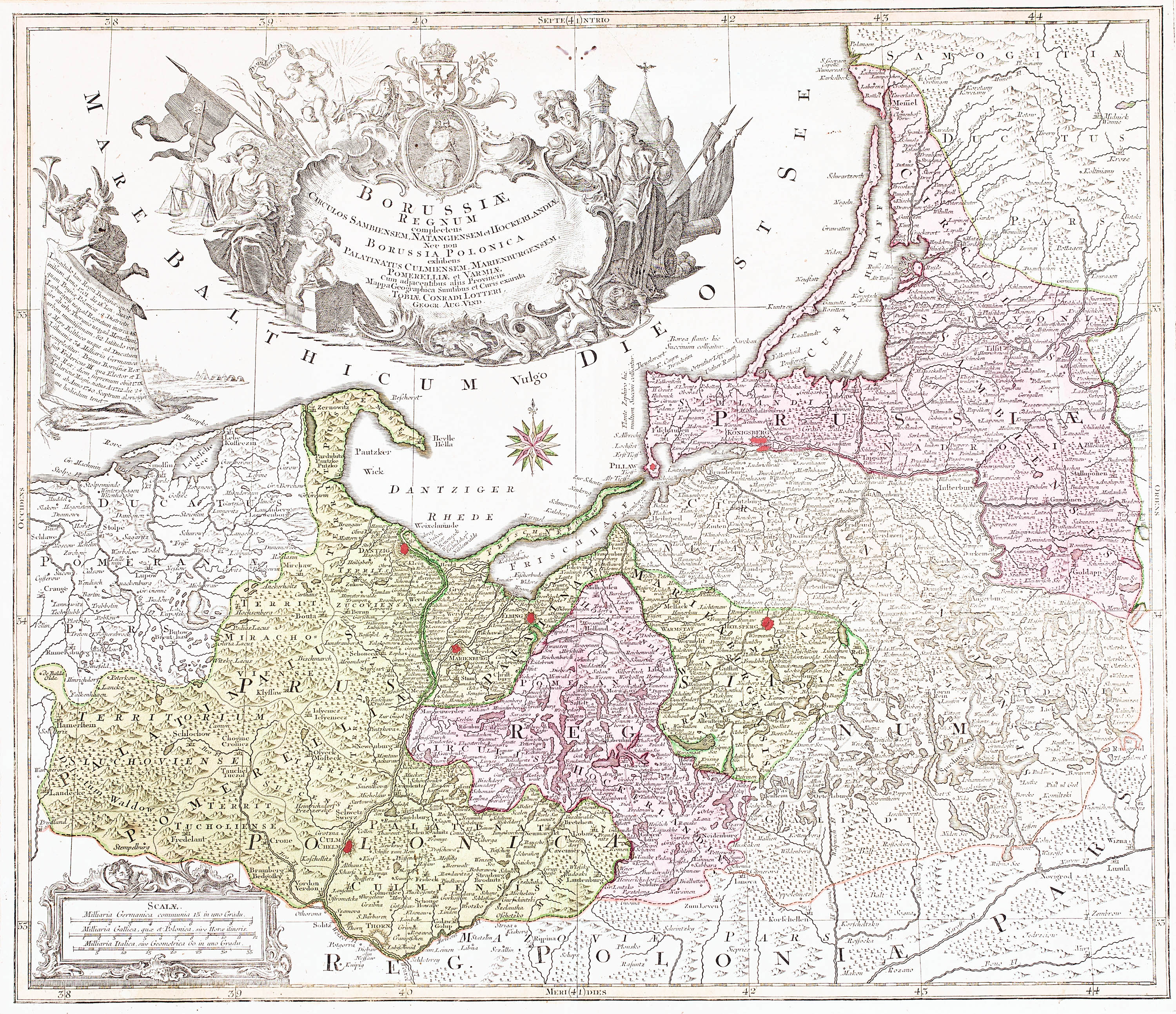 Mapa Prus, Augsburg, ok. 1770miedzioryt kolorowany, wym. mapy 49,5 x 57,5 cmstan zachowania dobry-, zbrązowiały papier, w górnej partii widoczne dziurki po molach