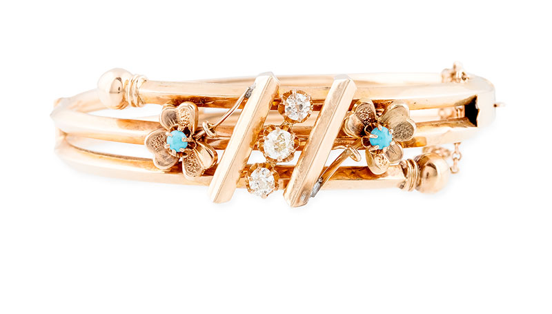 Austro-Węgry, XIX/XX w.złoto p. 0,580, m. 10,14 g, 3 brylanty w starym szlifie łącznie ok. 0,55 ct, 2 turkusy