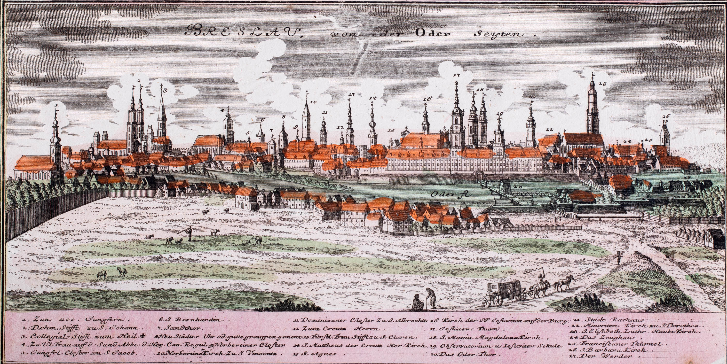 Widok Wrocławia pochodzący z „Scenographia Urbium Silesiae“, wyd. Spadkobiercy Homanna, Norymberga, 1737-1752 miedzioryt kolorowany w epoce, wym. arkusza 14,7 x 29 cm stan zachowania bardzo dobry, brak marginesów