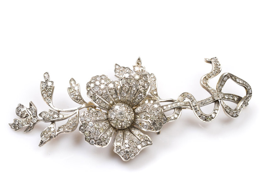 srebro werbletowane, złoto; 320 diamentów ł. ~ 10,00 ct H-K/VS-P, masa: 65,20 g; wym.: 12,5 x 6,0 cm; stan zachowania: 1 diament uszkodzony