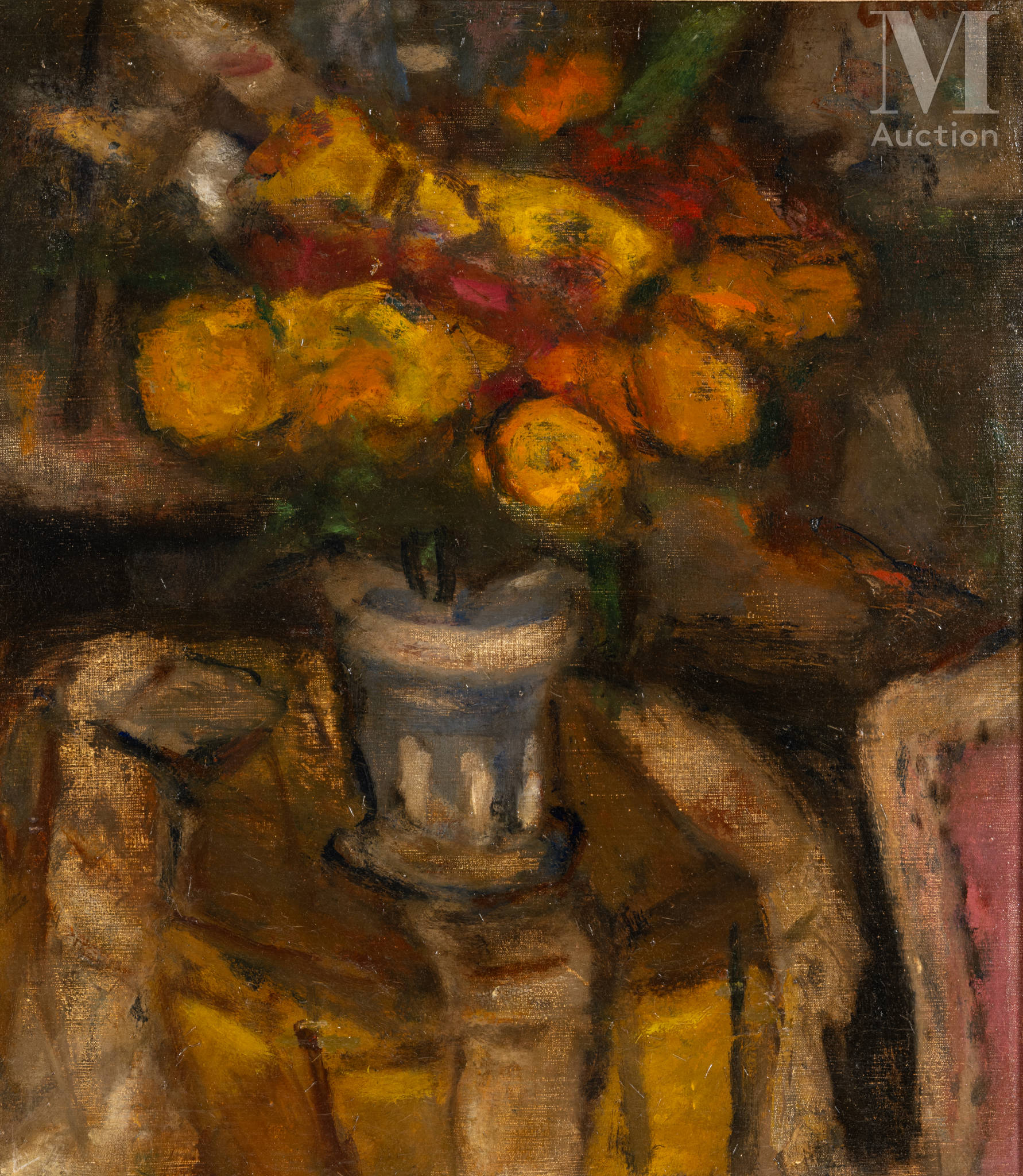 W tej pracy żółte i pomarańczowe kwiaty oraz oparcie różowego krzesła wyróżniają się na głębokim, ciemnym tle, tworząc delikatne akcenty.