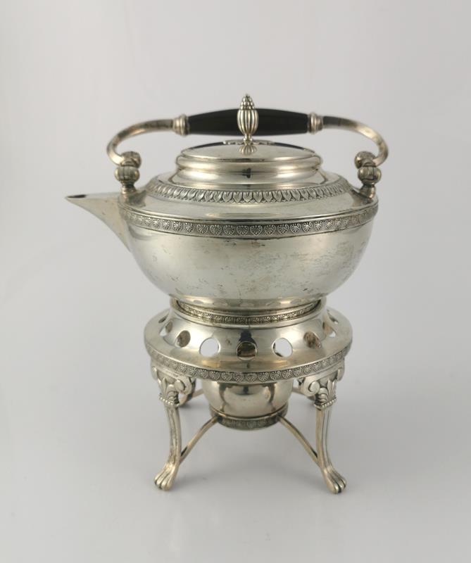 Buliera na cokoliku, ozdobionym moletowanym pasem palmetek, z gładkim brzuścem, na 3 wysokości ujęty w pas palmetek, wyżej, silnie przewężony, z pasem kimationu; wylew z krótkim dzióbkiem; nakrywka zwieńczona owocem na liściastej rozecie; ucho pałąkowate na zawiasach z rączką drewniana czernioną; stojak na czterech wysokich nogach zakończonych lwimi łapami, u nasady palmetami ze ślimacznicą, ujętych w obręcz z pasem palmetek, nakrytą ażurową podstawą na bulierę; nogi u dołu połączone krzyżakiem z kolistą obręczą , na której osadzony palnik cebulasty z wąską szyjką, z zatyczką na łańcuszku.
