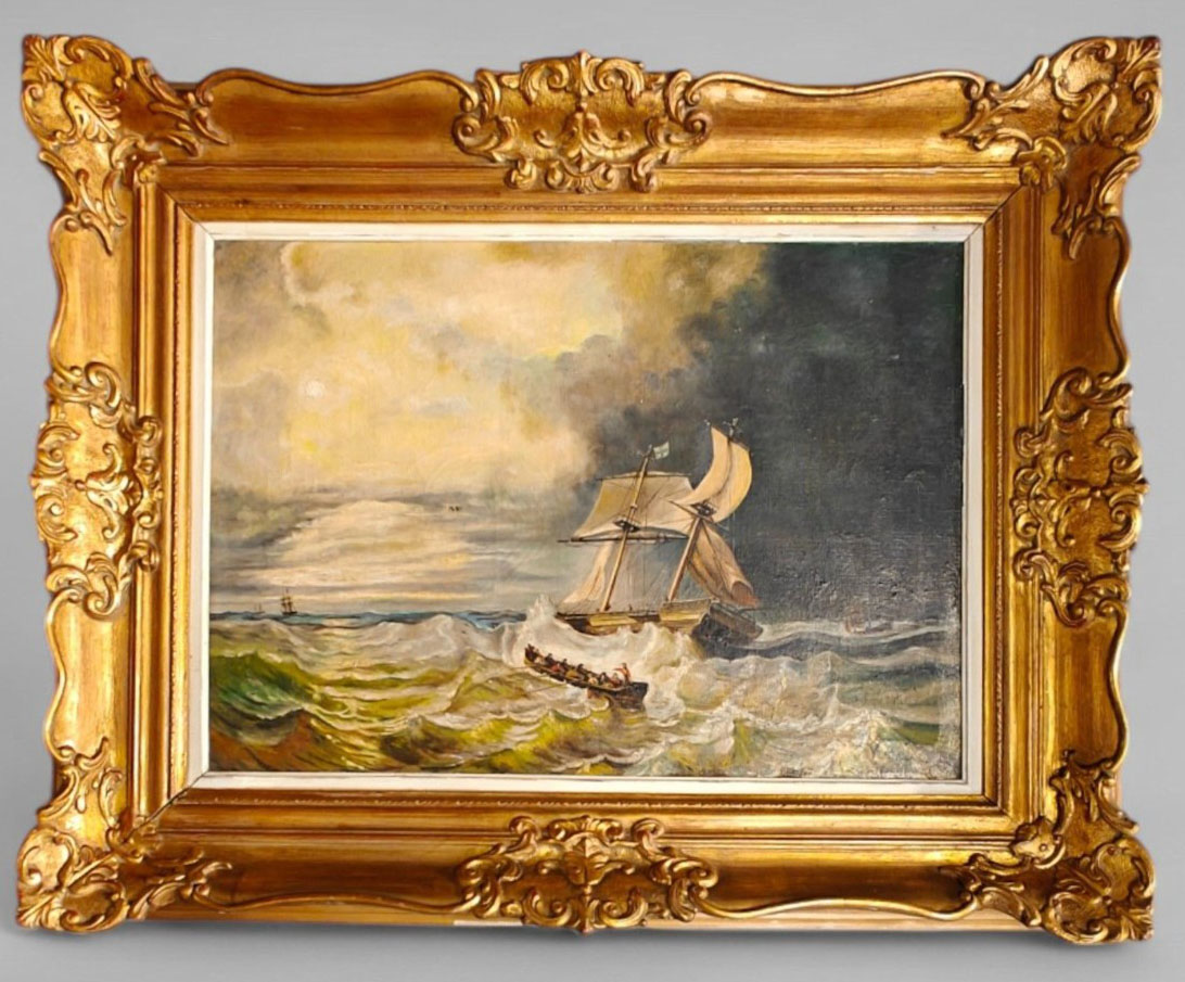 Olej na płótnie, 50 x 70 cm w świetle oprawy w podwójną ramę; zewnętrzna rama gipsowa na podkładzie drewnianym, złocona i bogato zdobiona o wym. 76 x 95 cm. (po drobnej konserwacji) Sygn. p.d. „Verheggen”.