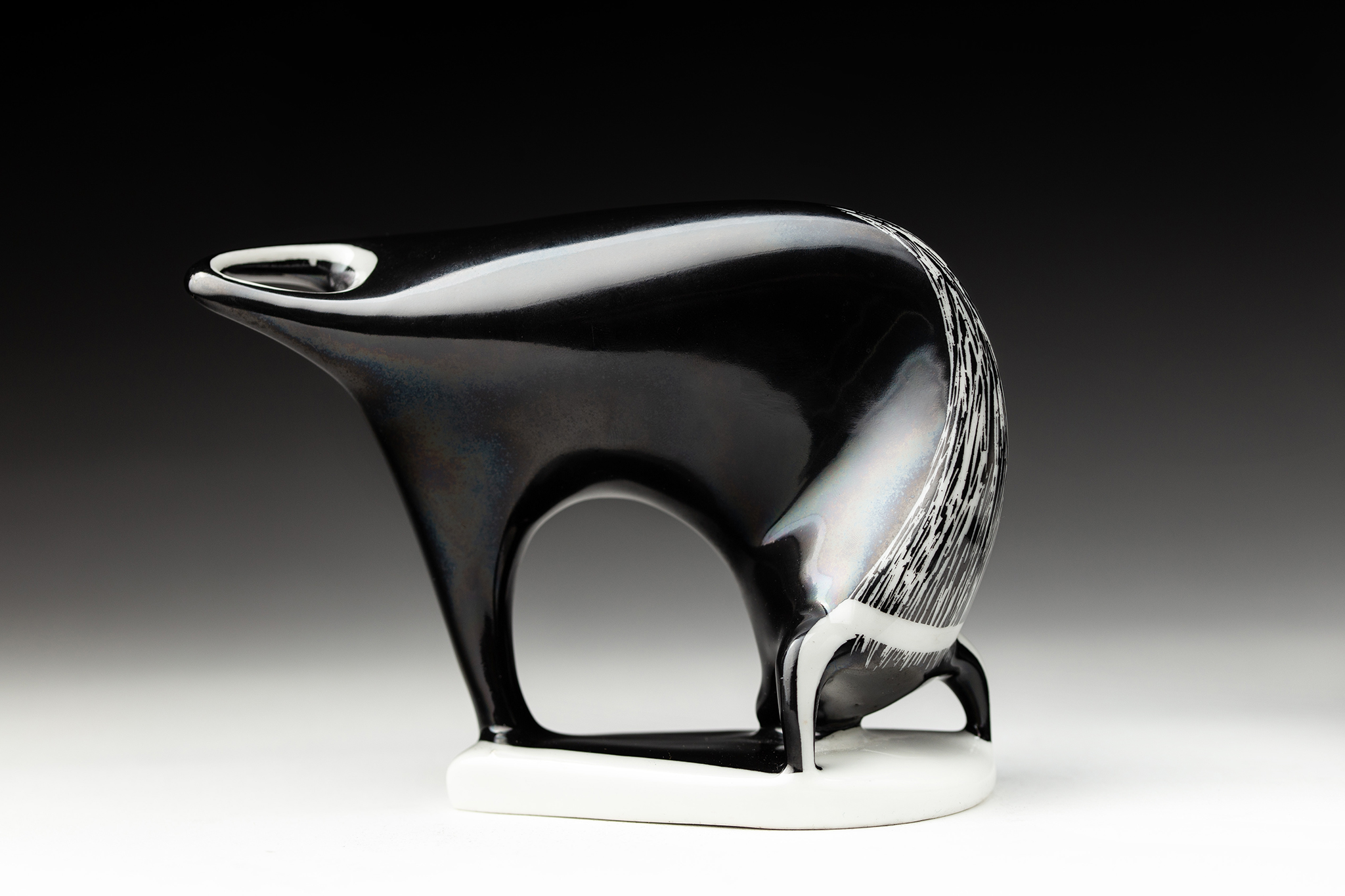 porcelana, natrysk ręcznie wybierany, 1958 rok, Bogucice, 12 x 17 x 7 cm, na spodzie zielony stempel fabryki: "B [w chmurce]" oraz numer modelu zapisany ręcznie: "5097/237.".
