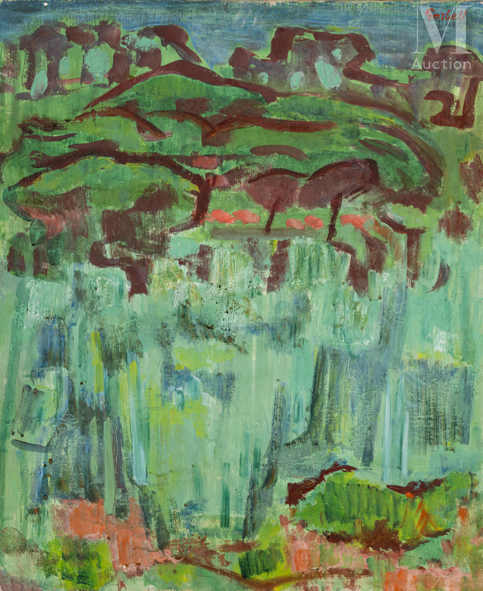 Olej, płótno65 x 54 cmSygn. p.g. „Garbell”Na odwrociu płótna stempel Garbell numer 673; na odwrociu ramy napis i data „la nartelle, roseaux et pins 1954”