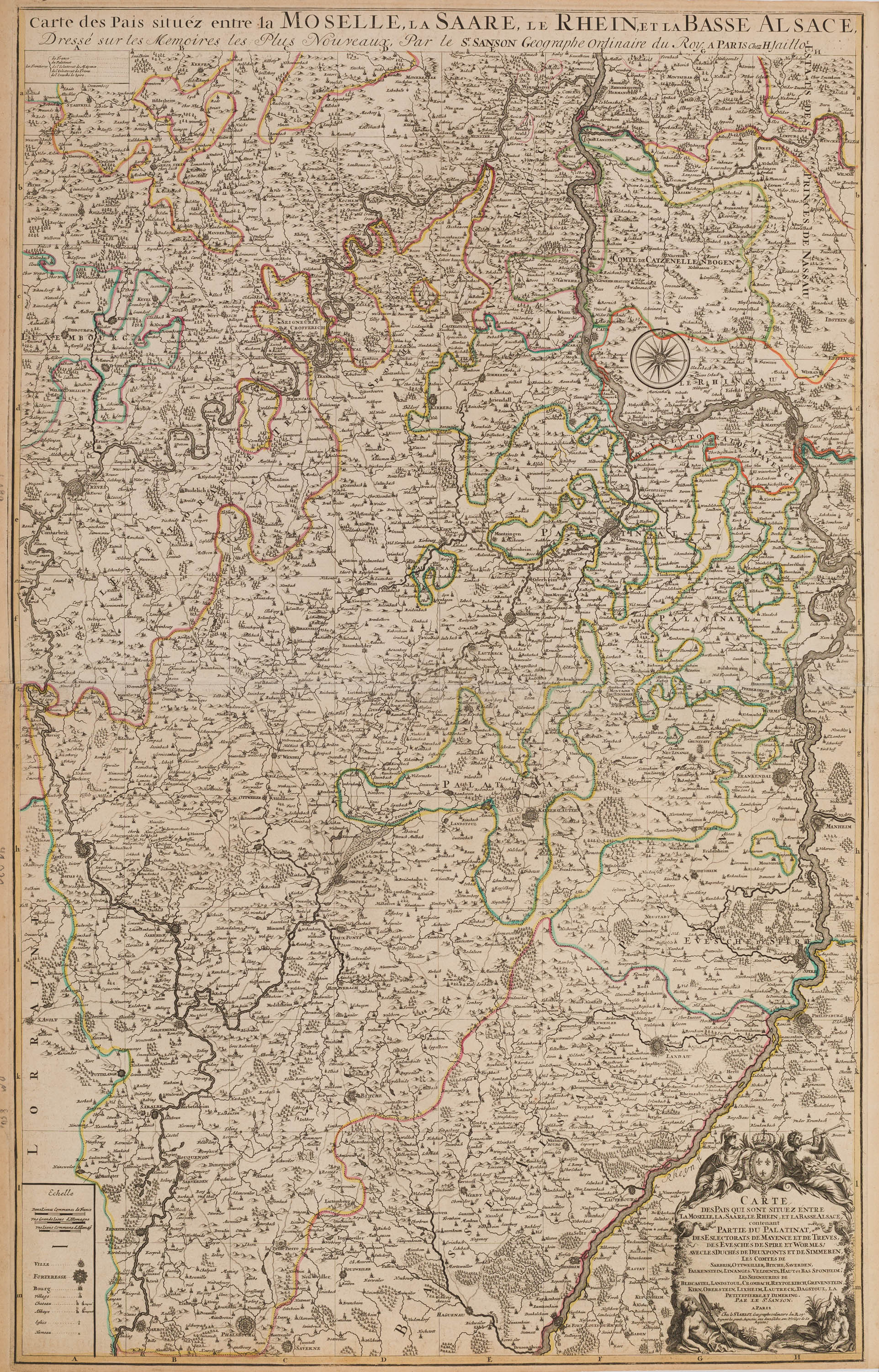 Mapa Niemiec ukazująca obszar między Saarą, Renem i Mozelą, wyd. Alexis-Hubert Jaillot, Paryż 1692 miedzioryt kolorowany liniowo, 95,3 x 59,7 cm (odcisk płyty) stan zachowania bardzo dobry