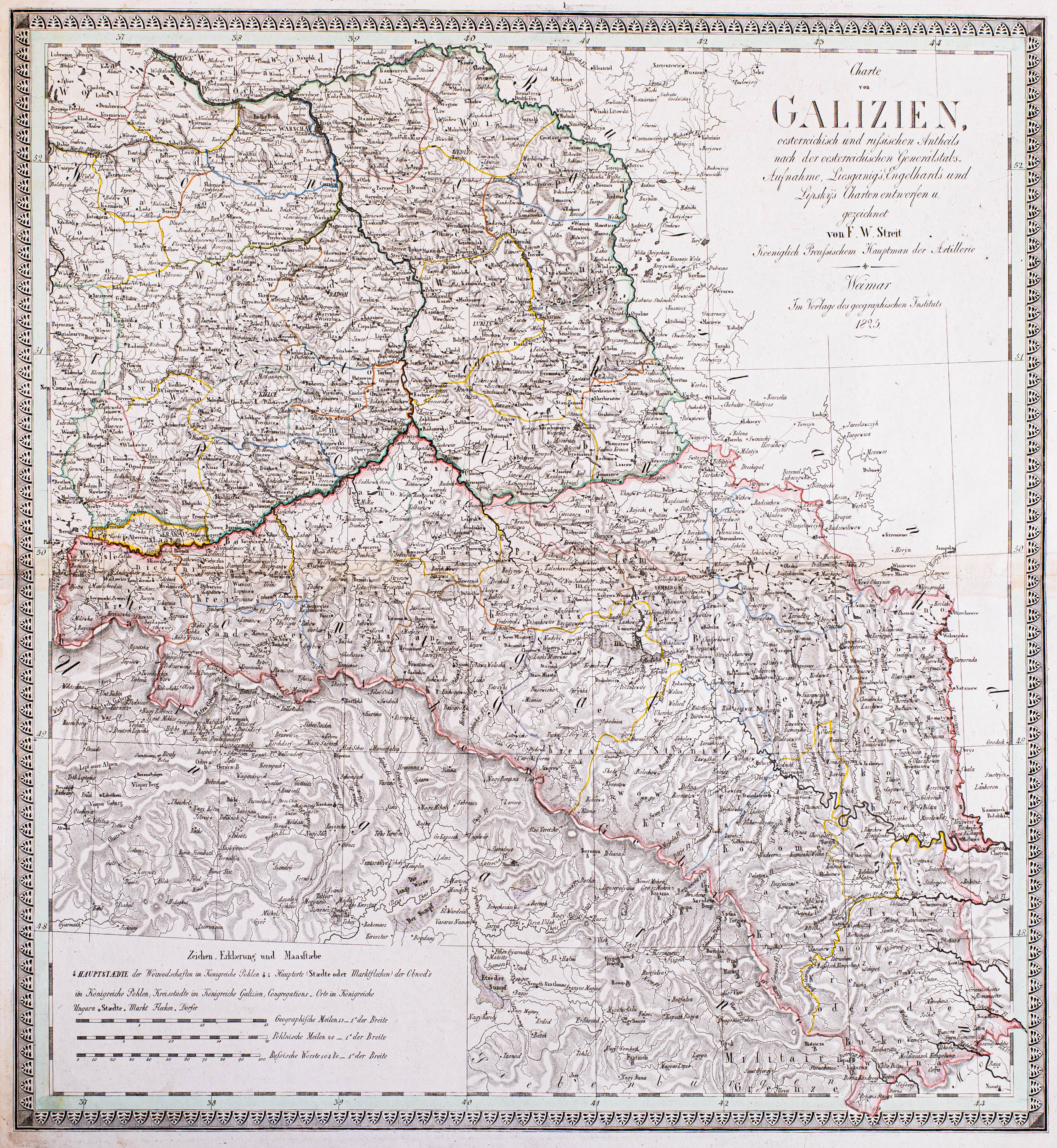 Mapa Galicji, Weimar, 1825miedzioryt kolorowany w epoce, 61 × 56 cm (odcisk płyty)stan zachowania bardzo dobry