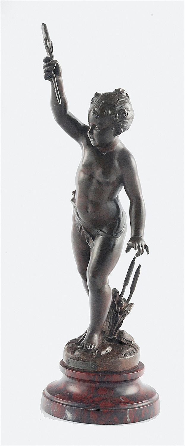 Nagi chłopczyk w przepasce na biodrach, kroczący z wysoko uniesioną pałką wodną, za nim na podstawie kępa szuwarów. Z przodu tabliczka mosiężna z napisem: " LA SOURCE / par Ferrand". Cokół toczony z czerwonego marmuru.