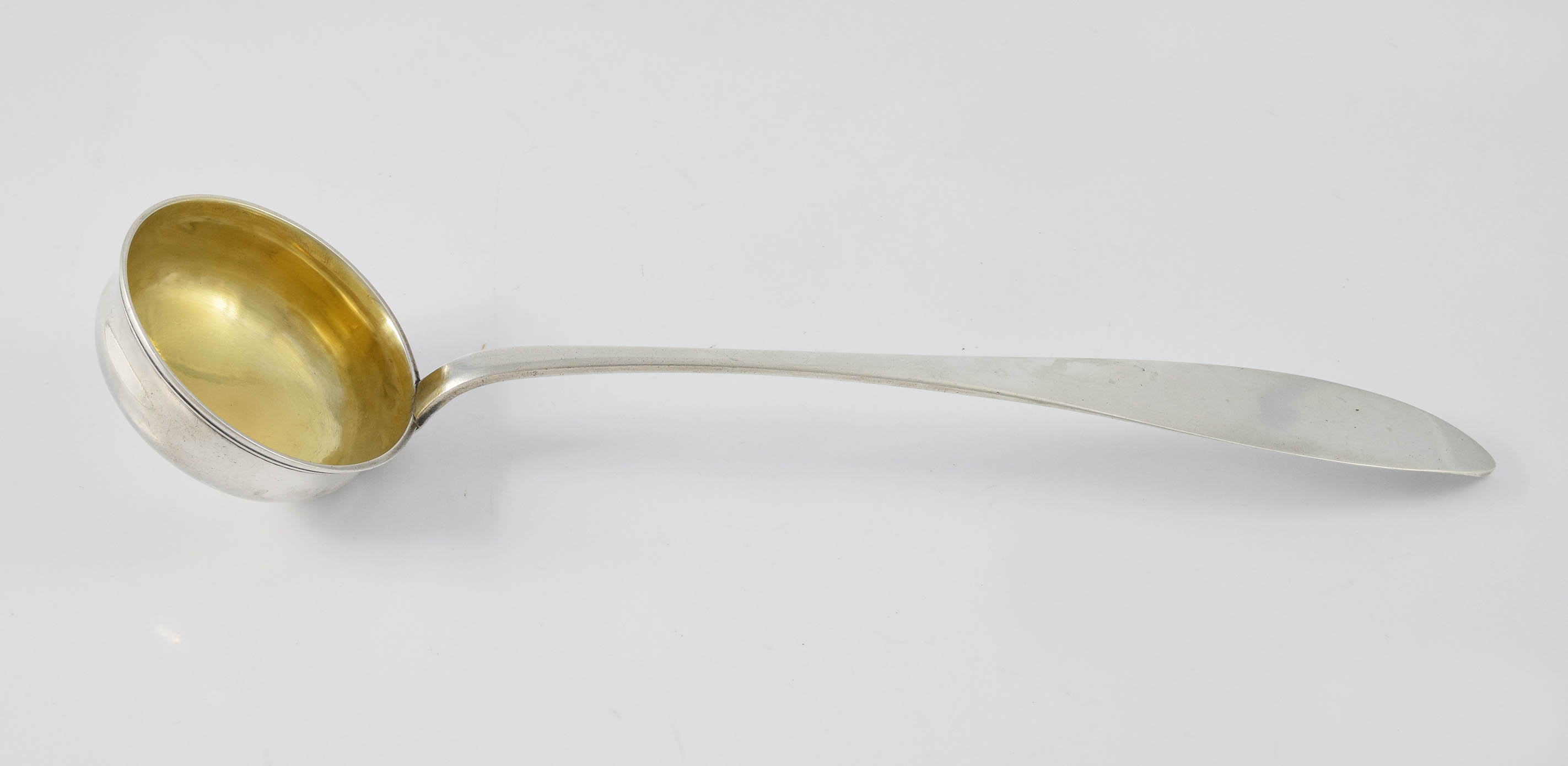 srebro, srebro pozłacane; dług. 37 cm, waga 217 g.; na odwrocie sygn.: Evers; znak wytwórcy. czerpak pozłacany. XVIII/XIX. Altona koło Hamburga. Joachim Lorenz Evers był żurnalistą, dyrektorem teatru i wydawcą.