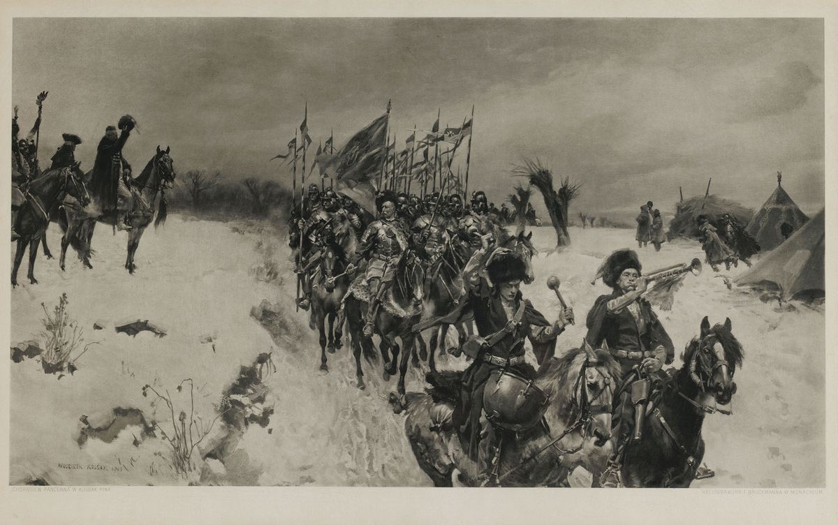 Heliograwiura, papier; 40 x 64 cm (w świetle p-p)Sygn. na płycie: WOJCIECH KOSSAK 1903; druk pod rycina: CHORAGIEW PANCERNA W KOSSAK PINX; HELIOGRAWURA F. BRUCKMANNA W MONACHIUM
