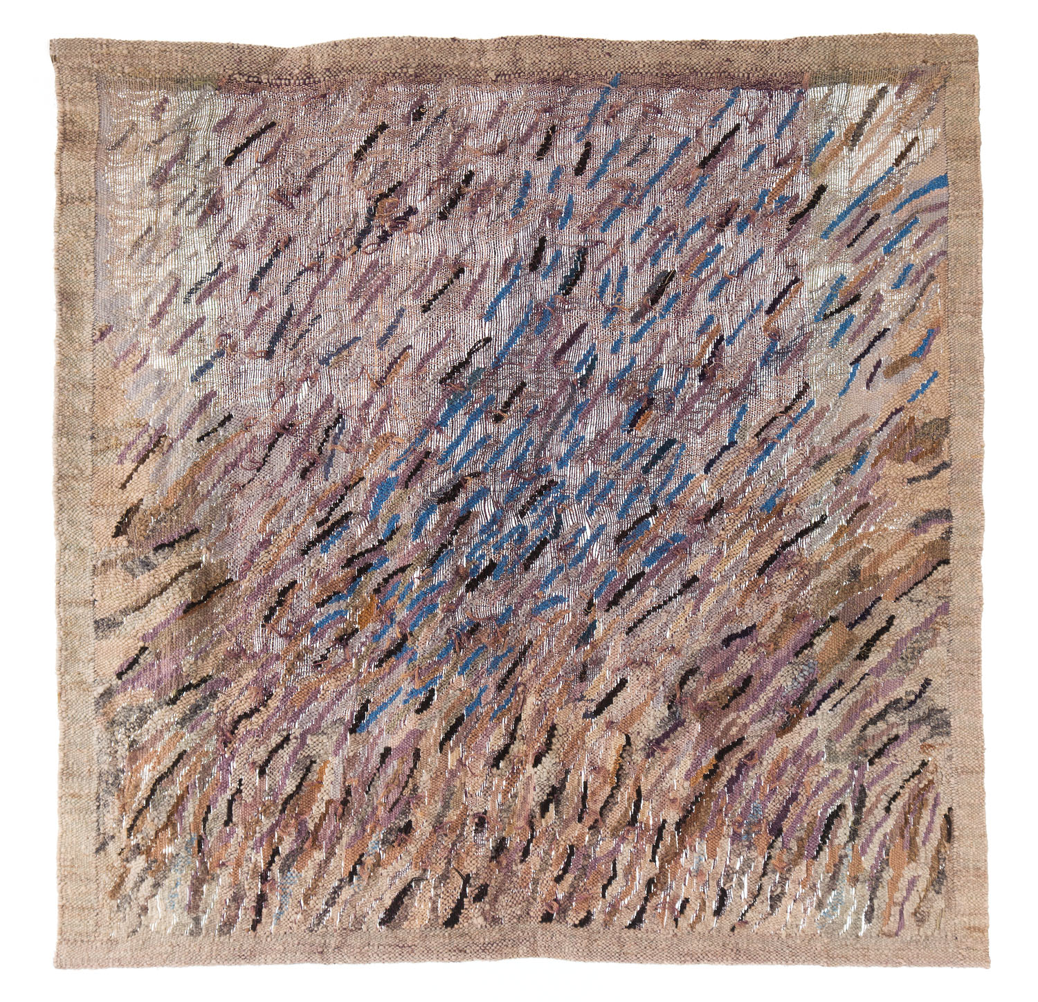 len, sizal, wełna, 170 x 185 cmna odwrociu autorska naszywka z odręcznym opisem pracy: 'KRYSTYNA DYRDA-KORYTKA | "Ciemny ogród - V" | 170x185 cm, 1989 | wełna, sizal, len | techn. mieszana'