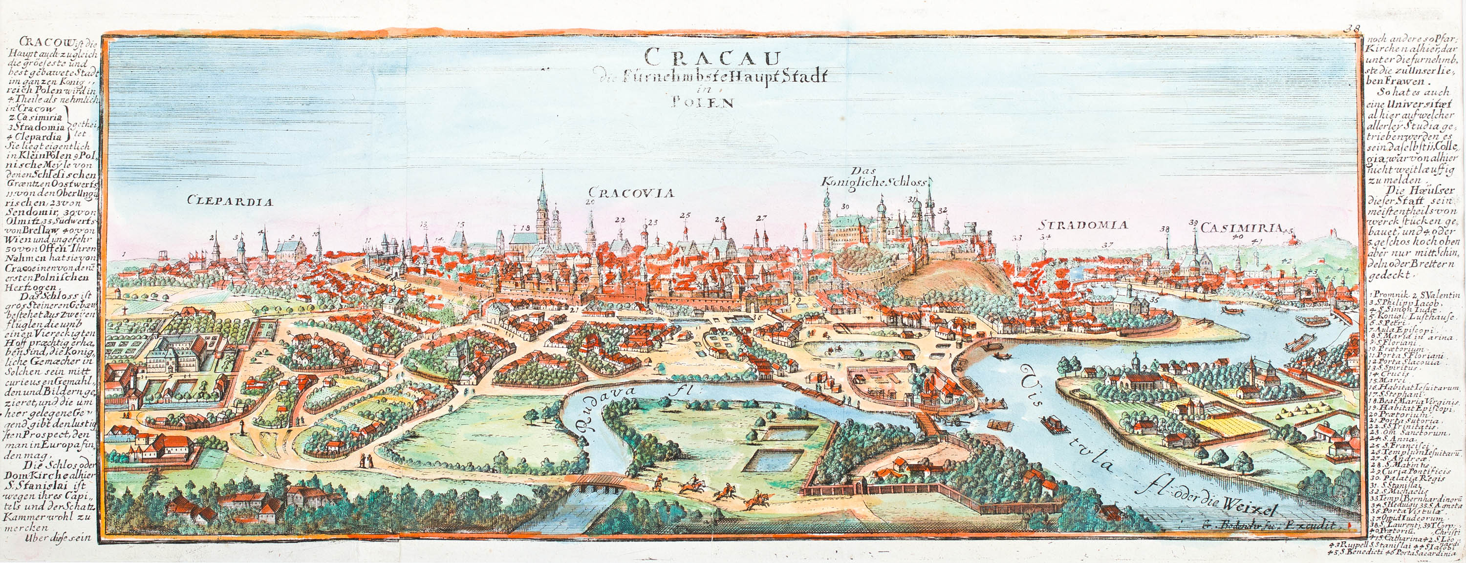 Panorama Krakowa, Augsburg, ok. 1720miedzioryt kolorowany (odbitka z dwóch płyty), 17,5 x 45 cm, w oprawie
