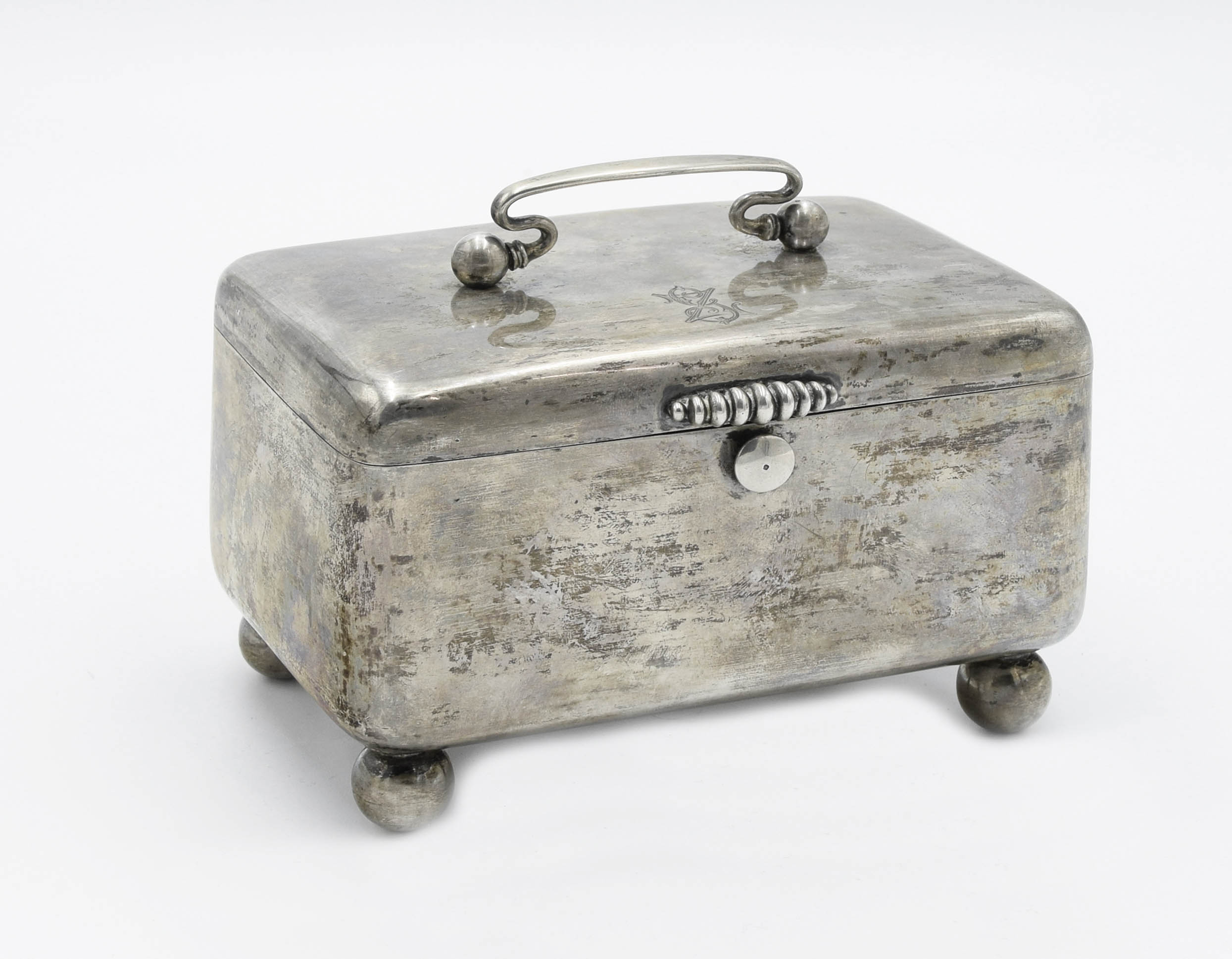 Wsparta na 4 kulkach, gładka, o krawędziach wyoblonych, z przyciskiem do otwierania nakrywki; nakrywka na zawiasie, z grawerowanym monogramem wiązanym ZG, zwieńczona uchwytem w formie antabki.