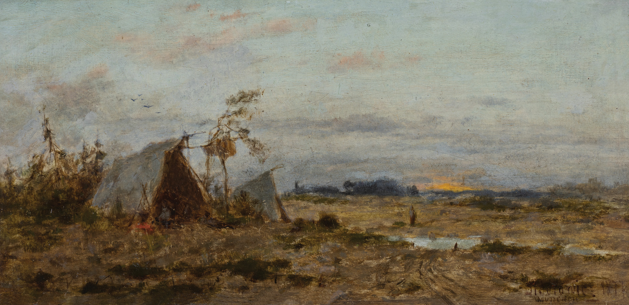 Sidorowicz często wracał do motywu obozowisk Cyganów, rozbijanych wśród wysokich sosen lub ukazywanych o zmierzchu. Ten ulubiony temat pojawia się wielokrotnie na jego obrazach z lat 70. XIX w. Przykładem jest tu dzieło z 1876 r., znajdujące się w zbiorach Muzeum Narodowego w Warszawie (patrzobok).
