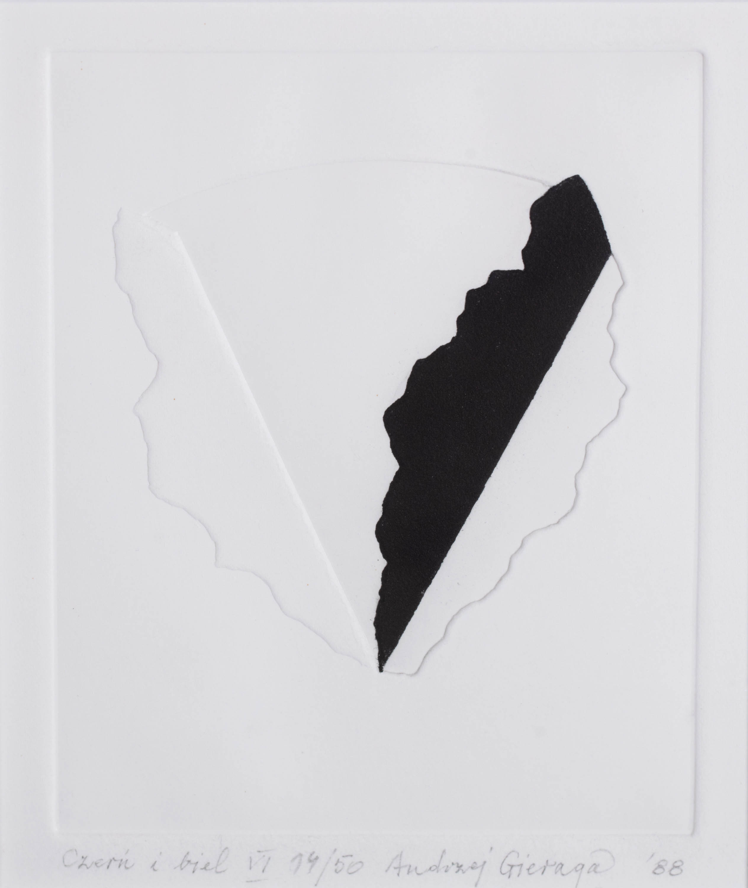 technika własna, relief, papier, 15 x 12 cm (wymiar kompozycji), ed. 14/50,sygnowany, datowany i opisany ołówkiem u dołu: 'Czerń i biel VI 14/50 Andrzej Gieraga '88'