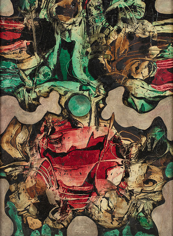 sygn. u dołu kompozycji: lenica, sygn. i opisany na odwrociu: A. LENICA / WARSZAWA / 1960 - 68 / 69 x 93 (olej - tempera) / "CZERWONE UMOCNIENIA" oraz wskazówka montażowa