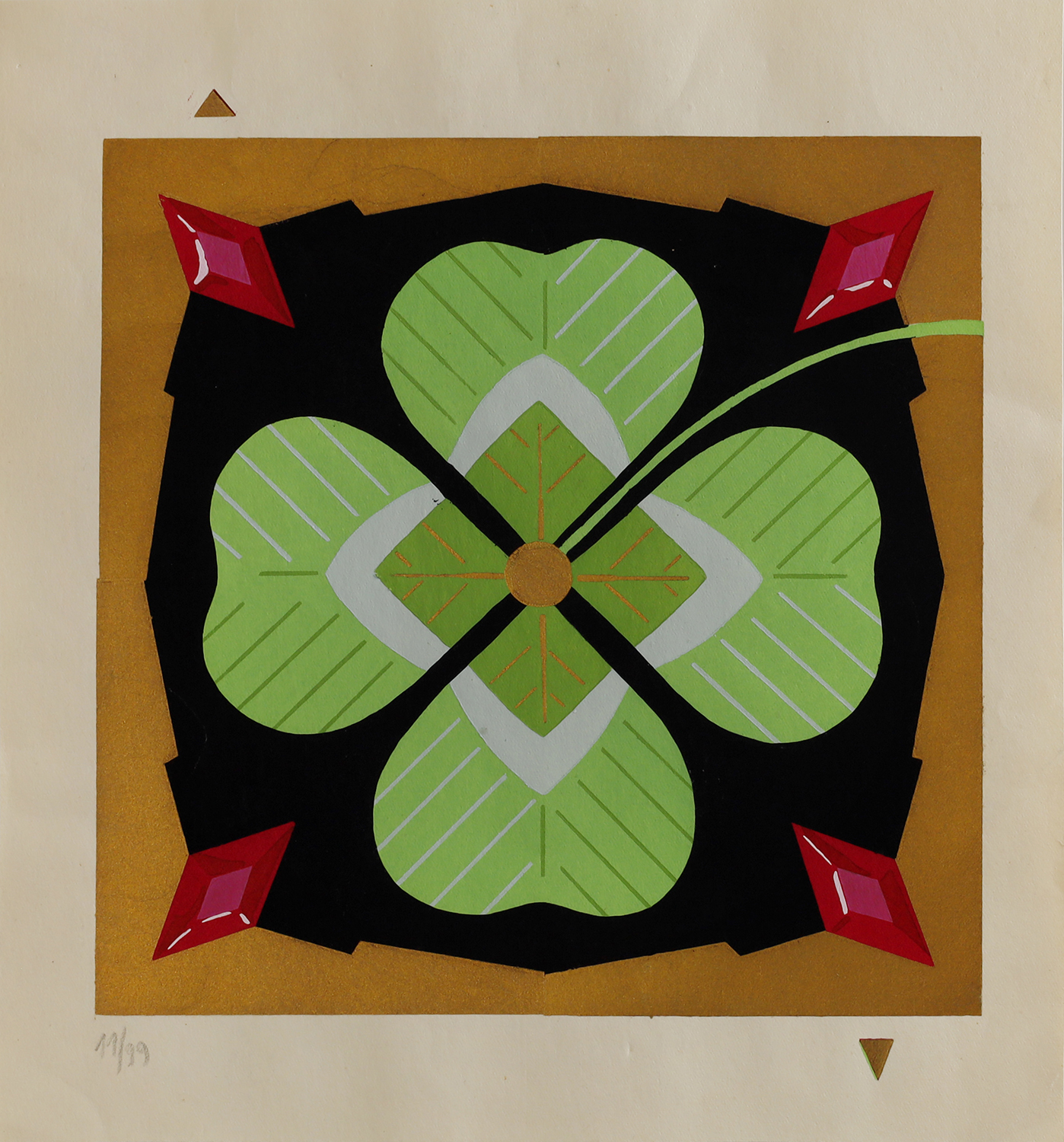 Technika pochoir była popularna w okresie międzywojennym w Paryżu, polega ona na nakładaniu gwaszu przez szablony. Stosowali ją słynni artyści jak Picasso i Zofia Stryjeńska. Piękne przedstawienie w stylu Art- Deco, zastosowano też farbę złotą, nie stosowaną przez wieki w grafice. Czterolistną koniczynę - symbol szczęścia otaczają cztery rubiny symbol miłości, namiętności i walki.