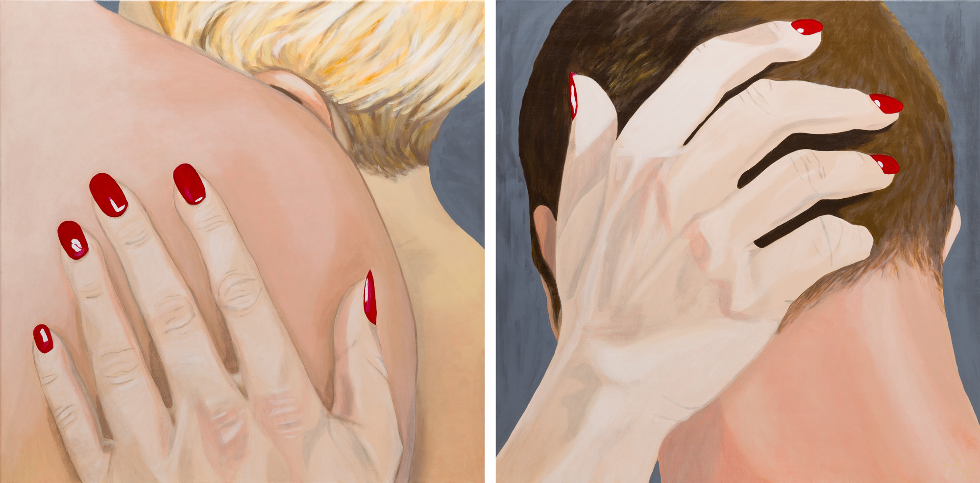 na odwrociu opisany: 'Anna Franczuk | "Czułość I" / Tenderness I" | "Czułość II" / Tenderness II" | Akryl na płótnie | 90 x 90 cm | 2018' (każda część)