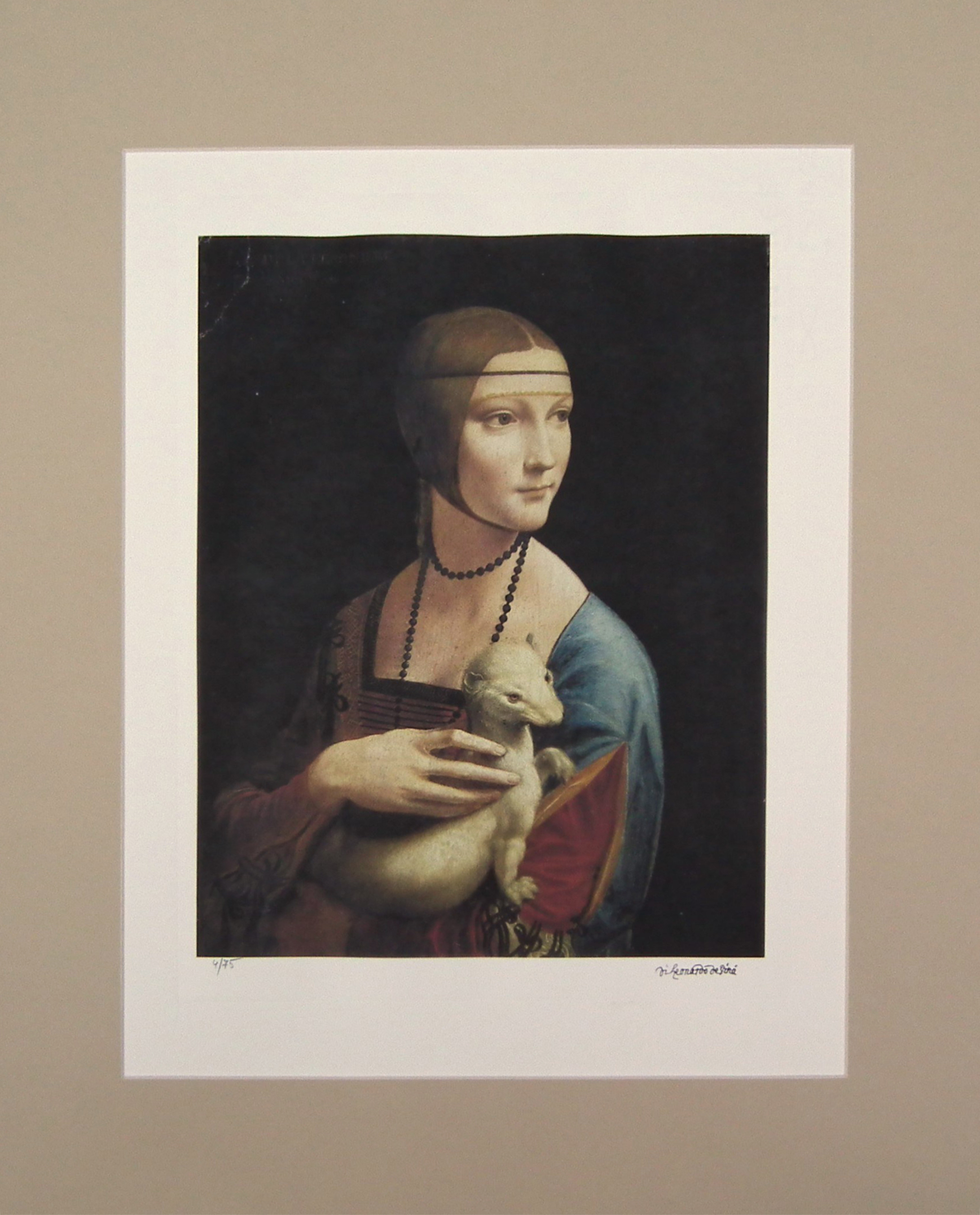 Na portrecie została uwieczniona Cecylia Gallerani, kochanka księcia Ludwika Sforzy. Historyk sztuki Antonina Vallentin, porównując uśmiech Cecylii z uśmiechem Lisy Gherardini na obrazie Mona Lisa stwierdziła, że Cecylia jest młodszą siostrą Lisy, która za wcześnie straciła dzieciństwo.Gronostaj zawiera liczne skojarzenia. Według tradycji gronostaj symbolizuje czystość i niewinność. Zwierzę to stanowi również aluzję do Ludwika Sforzy, który od 1488 roku nosił tytuł Gronostaja (L’Ermellino). Gronostaj ma na obrazie czujne oko a jego przednia łapa jest silnie umięśniona. Gronostaj znajdowało się również w godle Ludwika Sforzy. Heliograwiura rozpowszechniona w XIX wieku została wyparta później przez rotograwiurę, gdyż heliograwiura jest metodą drogą i bardzo czasochłonną. Obecnie bywa używana w grafice artystycznej. Płyty otrzymane techniką heliograwiury można uzupełniać innymi metodami technik druku wklęsłego. Sporadycznie używa się tej techniki także przy reprodukcji dzieł sztuki, gdy trzeba stworzyć niewielką liczbę kopii o bardzo wysokiej jakości.