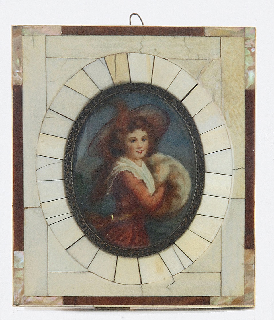 gwasz, kość?; 8,5 x 6,5 cm (wymiar owalu w świetle oprawy);sygn. l. d.: LeBrun;Wdług Élisabeth VIGÉE-LEBRUN (1755-1842);oprawa bogato inkrustowana macicą perłową.