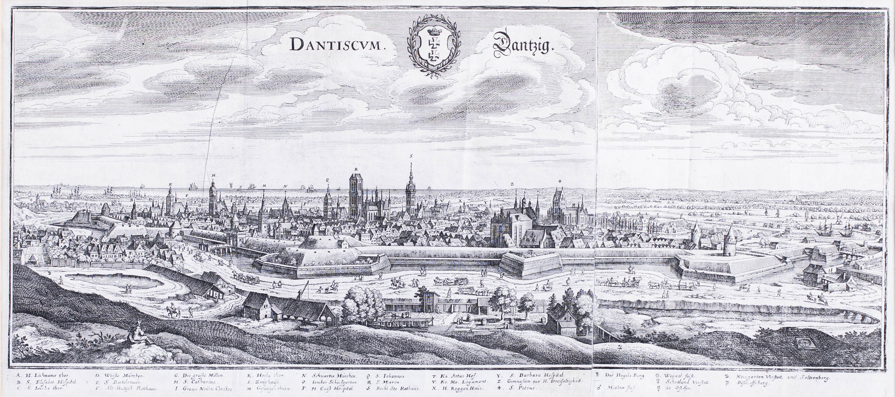 Widok Gdańska z Biskupiej Górki, pochodzący z dzieła „Topographia Electoratus Brandenburgici et Ducatus Pomeraniae”, wyd. Spadkobiercy Meriana, Frankfurt n. Menem, 1652