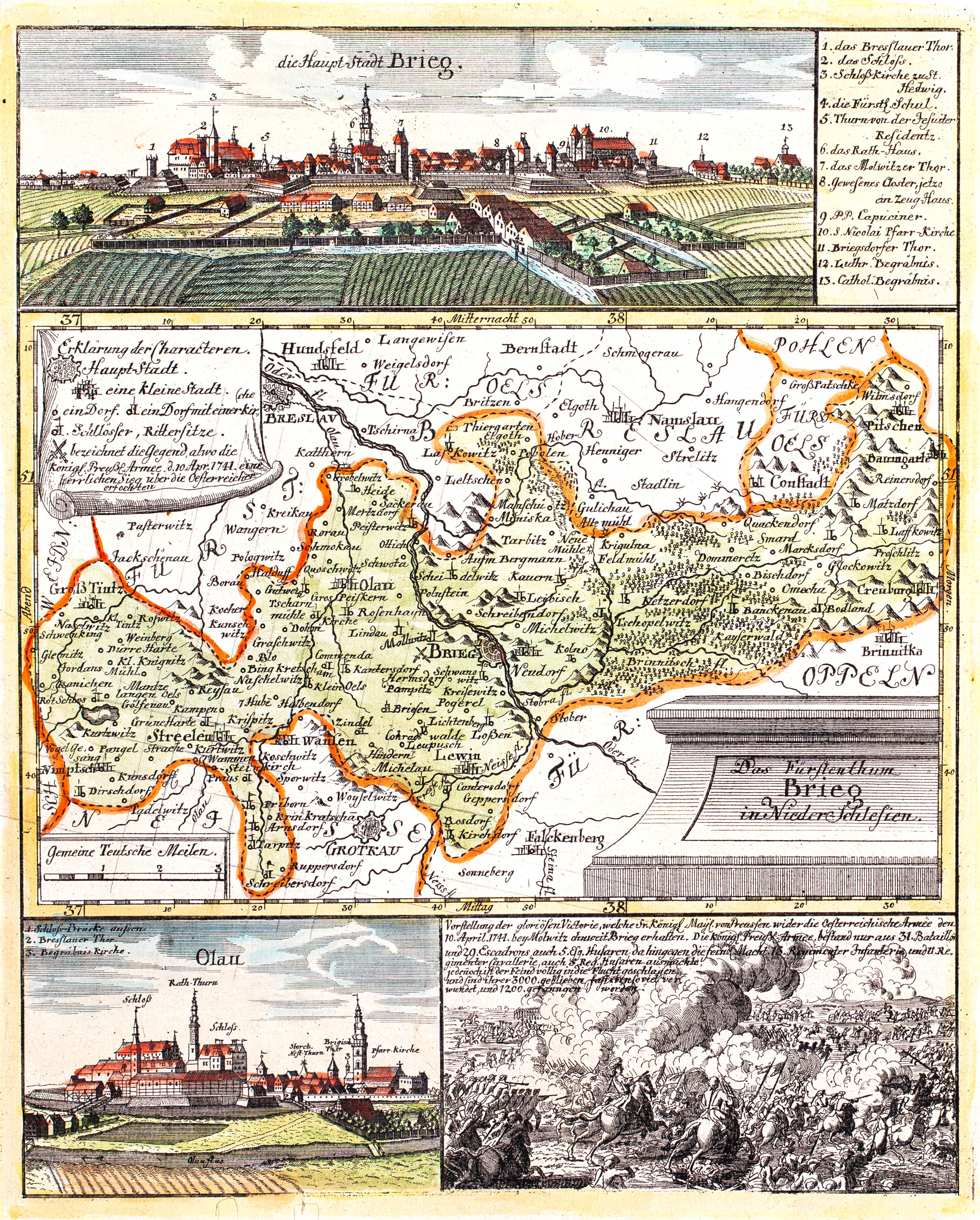 Mapa Księstwa Brzeskiego z widokami Brzegu i Oławy, wyd. Johann David Schleuen, Berlin, 1741 miedzioryt kolorowany w epoce, 33 x 26,5 cm (odcisk płyty) stan zachowania: po konserwacji rzadkie