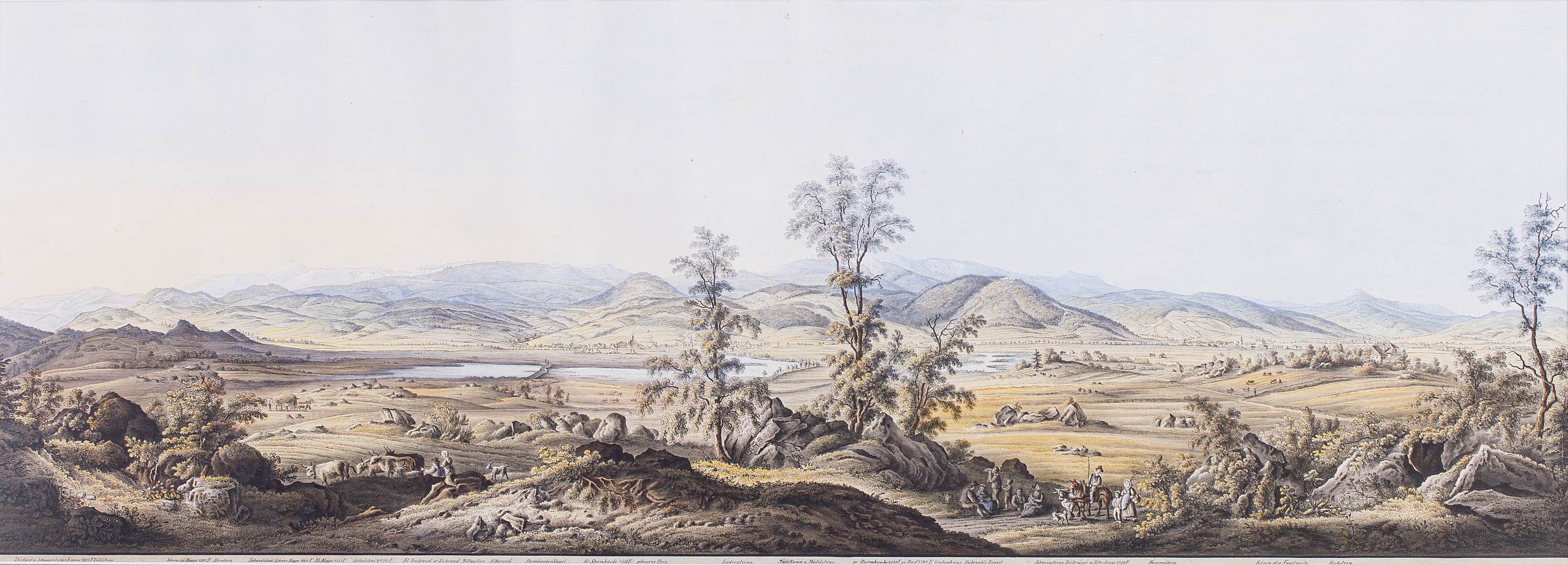 Panorama Karkonoszy między Cieplicami a Marczycami, Kowary, po 1827 litografia kolorowana, 31,5 x 88,5 cm w świetle oprawy stan zachowania: niewielkie zabrudzenie w partii nieba