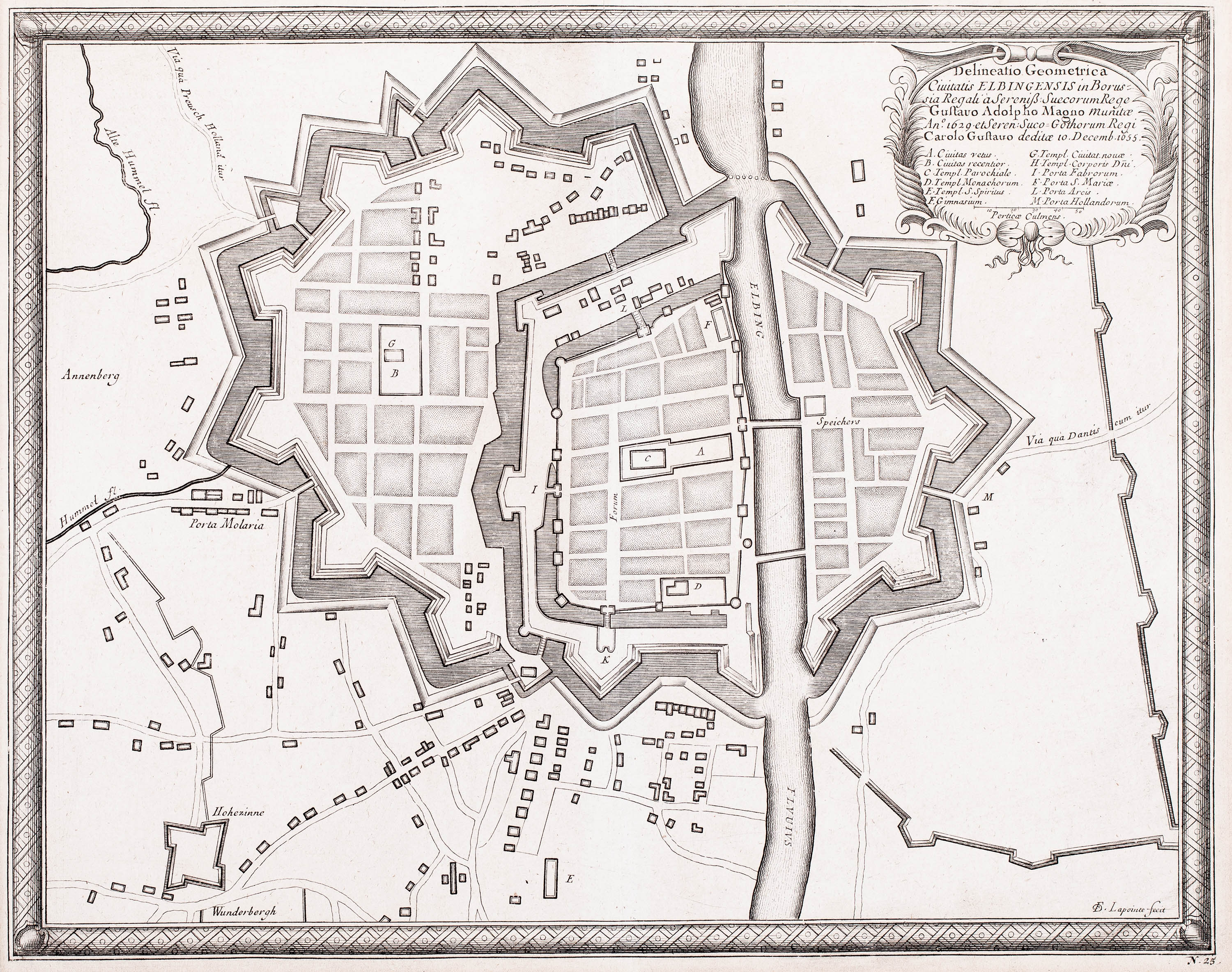 Plan Elbląga i jego fortyfikacji, pochodzący z dzieła S. Pufendorfa "De rebus a Carolo Gustavo…” , Norymberga, 1696miedzioryt, wym. widoku 24,6 x 31,5 cmstan zachowania bardzo dobry