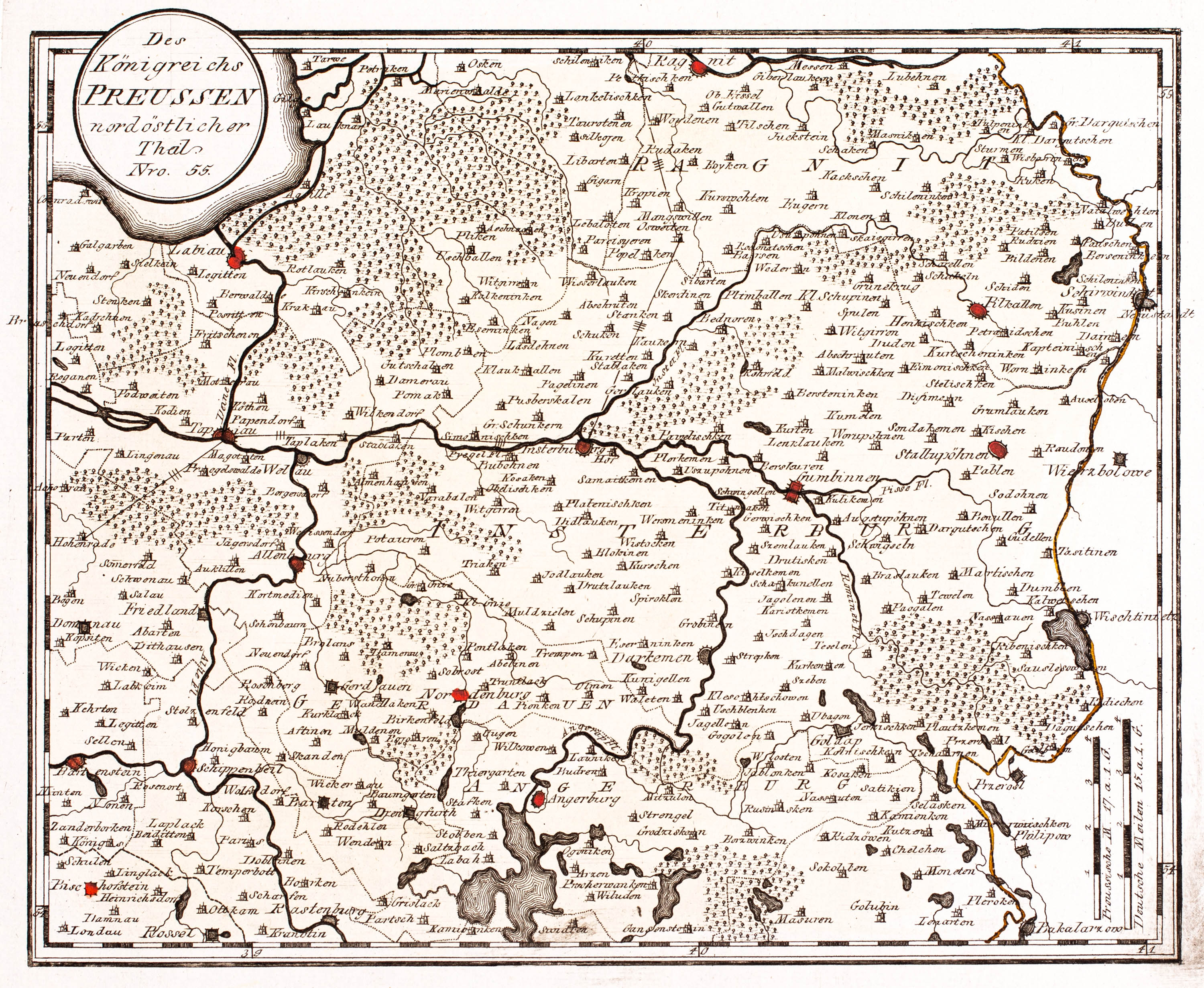 Mapa północno-wschodniej części Królestwa Prus (Mazury), pochodząca z dzieła „Schauplatz der fünf theile der Welt ...”, Wiedeń, 1789 miedzioryt kolorowany, 24,5 x 29,3 cm (odcisk płyty) stan zachowania bardzo dobry